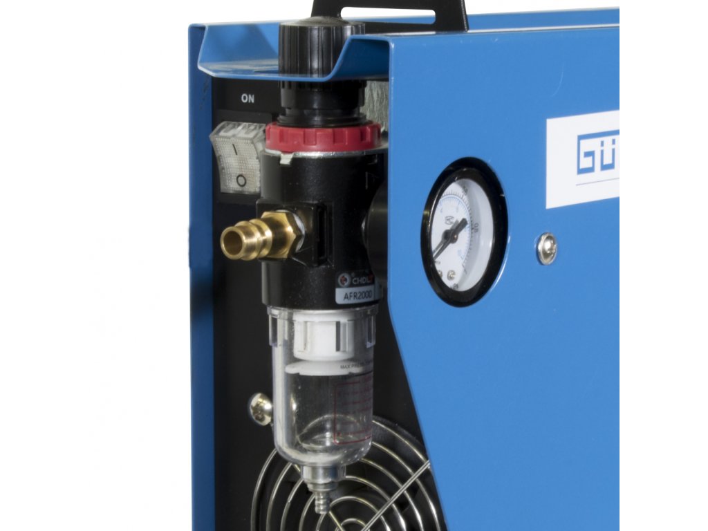 Aufbau: Stahlblechgehäuse, Druckminderventil mit Filter, Manometer, Lüfter, Transportgriff.
