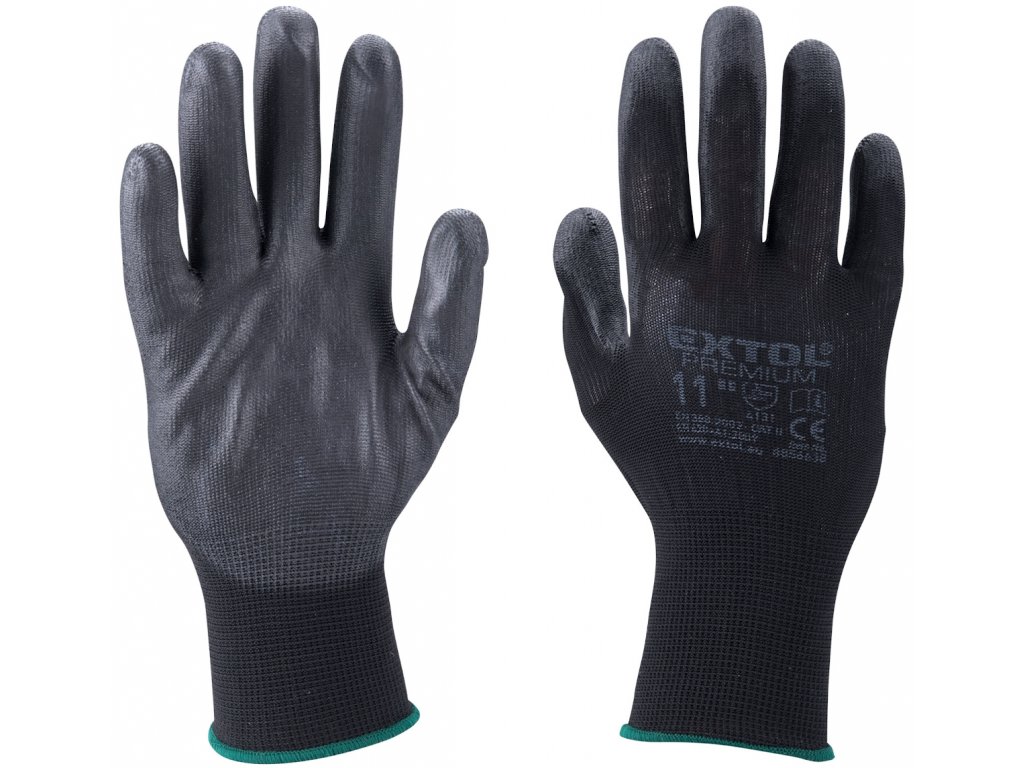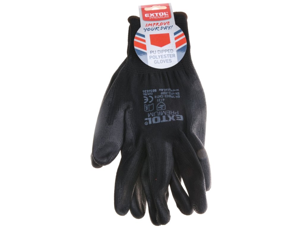 Schwarz, nahtlose Ware aus feinem Polyester (PES), Handfläche und Finger mit dünner Polyurethan-Schicht (PU), elastische Manschette, gemäß EN 388, CE, Schutz gegen mechanische Gefahren 4131, zum Schutz gegen mechanische Einflüsse bei der Handhabung mit Teilen in trockener und nassen Umgebung bestimmt. Größe 8".