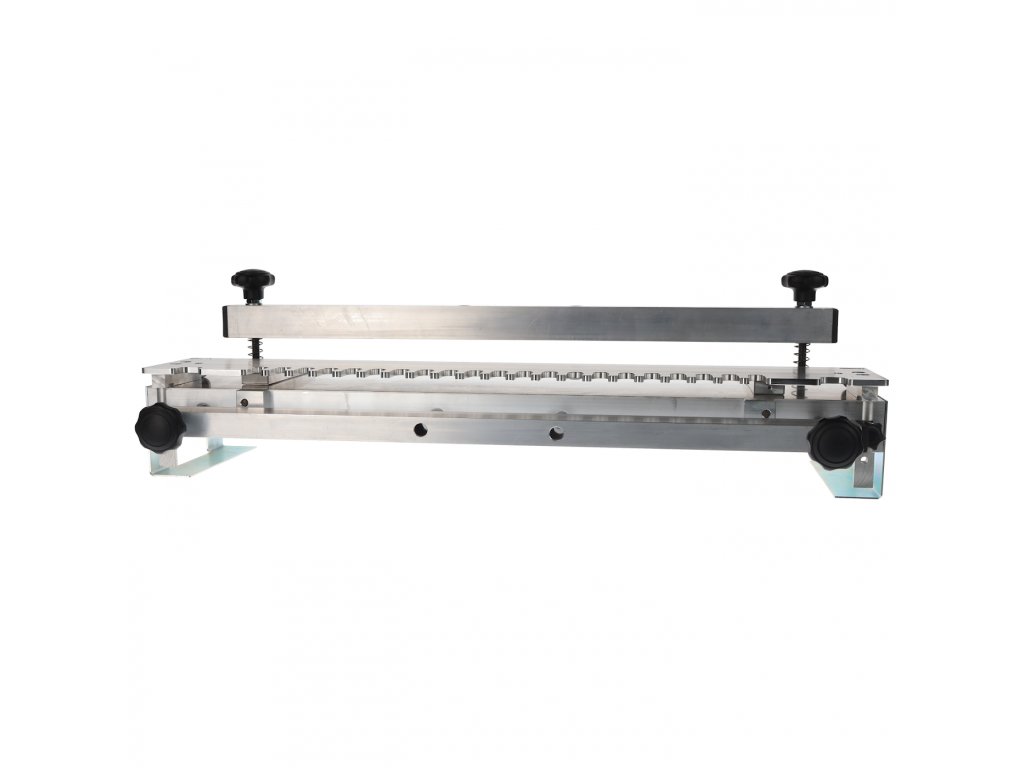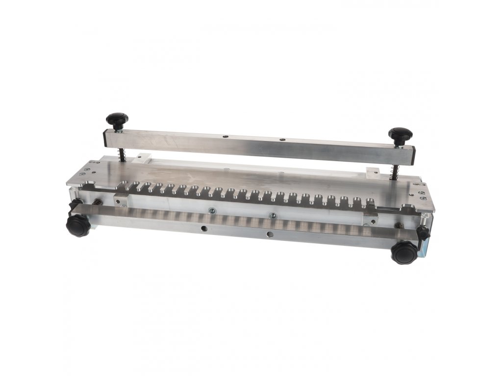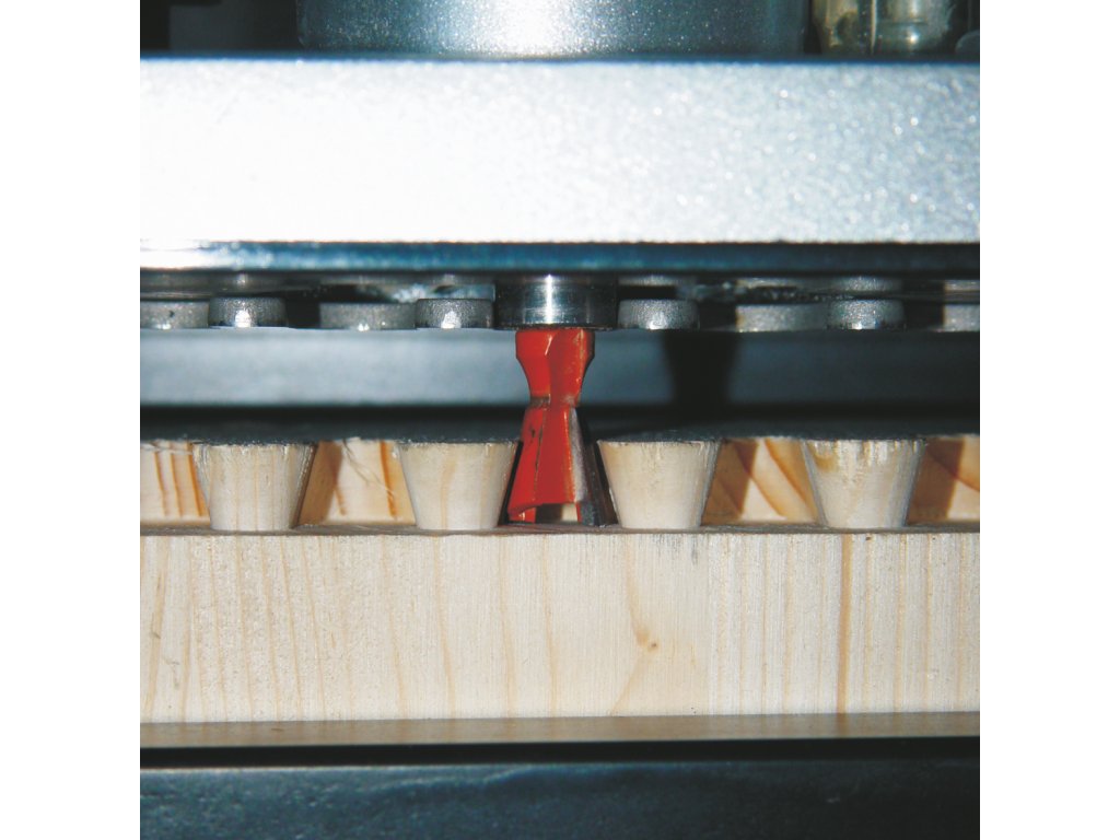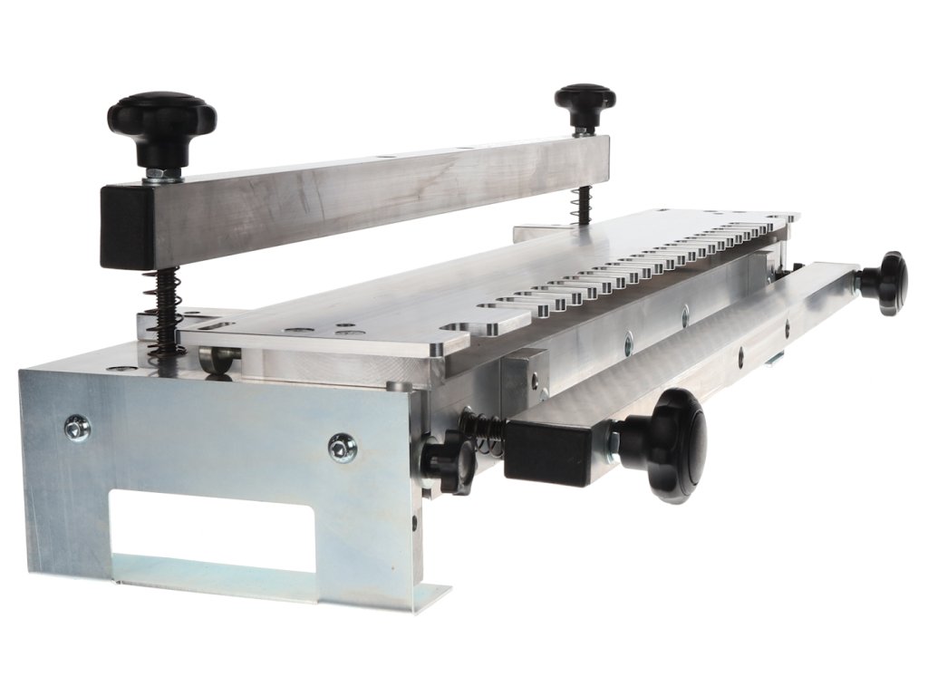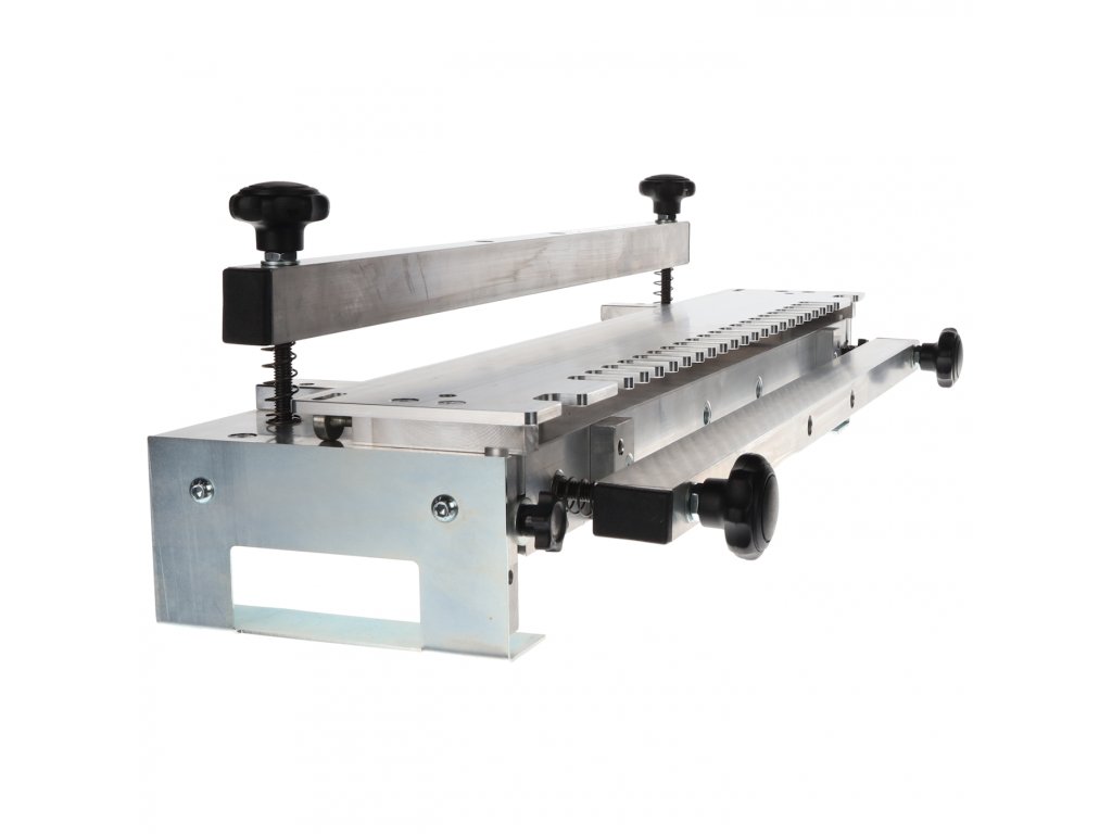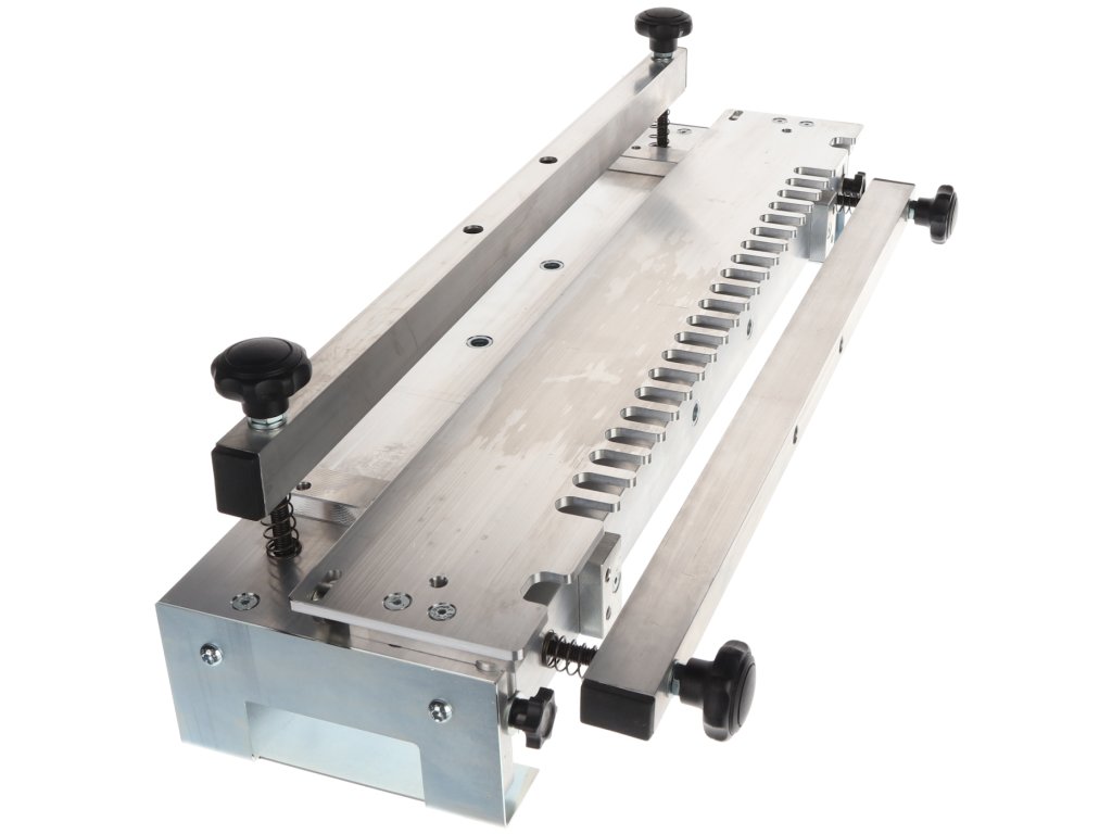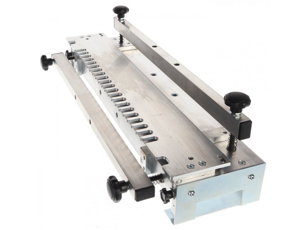 Vorrichtung zum Fräsen von Zinkenverbindungen bis zur Breite 400 mm. Schablonenraster 20 mm – zum Fräsen von herkömmlichen Breiten der Plattenverbindungen – also der Vielfachen von 10 oder 20 mm. (Wenn der Raster z.B. für einen Schritt von 21,3 mm konstruiert wäre, müssten dann optimal die nicht standardmäßigen Breiten z.B. 21,3; 42,6; 63,9; 85,2; 106,5; 127,8; 149,1 verbunden werden.) Der Raster wurde für den Schwalbenschwanzfräser-Ø 12,7 mm berechnet. Für die Werkzeugführung wird ein spezieller Kopierring mit Ø 12,7 mm verwendet, oder kann man auch ohne den Kopierring mit einem Werkzeug mit Führungslager-Ø 1/2" fräsen.