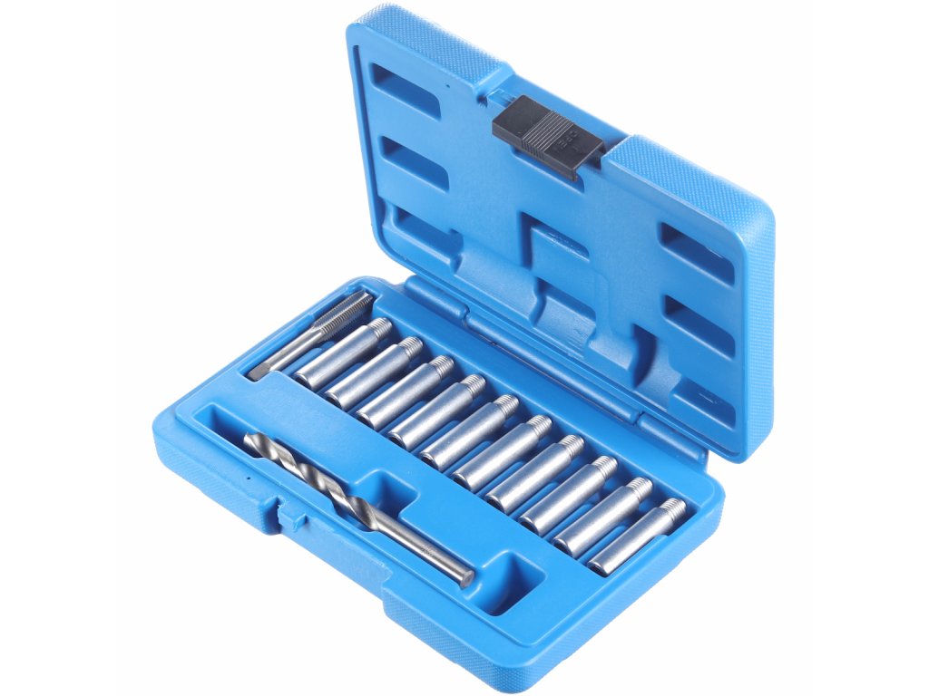 Das beschädigte Gewinde wird mit dem mitgelieferten Bohrer ausgebohrt und mit dem Gewindebohrer M10 × 1,25 wird neues Gewinde geschnitten. In dieses wird ein neuer Bolzen eingeschraubt. Im Set sind ein Bohrer, ein Gewindebohrer und 10 Bolzen enthalten. Verwendbar für Fahrzeuge der Marken VW, Audi, Seat, Škoda, Ford, Opel und weitere. In einem Kunststoffkoffer geliefert.