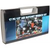 1/2"-Druckluftknarre mit L- und R-Lauf, für einfache Schraubverbindungsmontage und -demontage. Geeignet für enge Platzverhältnisse, wo keine Bewegung mit einer klassischen mechanischen Knarre möglich ist. Arbeitsdruck 90 PSI, max. Drehmoment 69 Nm, Leerlaufdrehzahl 160/min., Werkstoff Stahl/Aluminium. Zubehör: geschwärzte Nüsse 9, 10, 11, 13, 14, 17 und 19 mm, Verlängerungsaufsatz 75 mm, Adapter für Schraubbits, Schnellkupplungseinschub G1/4"AG, 3 Bits und Öler. Alles in einer Kunststoffkassette aufbewahrt.