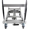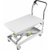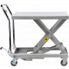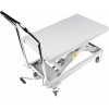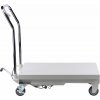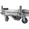 Tragfähigkeit 300 kg, Möglichkeit zum Anheben der Ladefläche 240 - 775 mm, Abmessungen der Ladefläche 820 × 520 mm. Der Wagen ist mit 2 festen und 2 drehbaren Rollen mit einem Durchmesser von 100 mm ausgestattet.