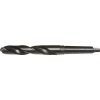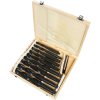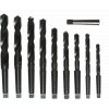 Zylinderbohrer mit Kegelschaft MK1 - 14 mm, MK2 – 16, 18, 20, 22 mm, MK3 – 24, 26, 28, 30 mm, Reduktionsbuchse MK2 – MK1) zum Bohren in Stahl, legierten oder unlegierten Gußstahl, Stahlguß, Guß, Buntmetalle (Messing, Bronze) u.ä. Rechtsschneidende Bohrer, Spitzen mit Kegelschliff (Spitzenwinkel 118°), schwarze Ausführung, Satz in Holzkassette.