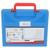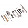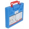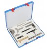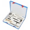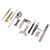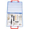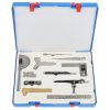 Zur Längen-, Winkel- und Gewindemessung im Maschinenbau sowie in der Bastelwerkstätte. Stahl-Messlehre 150 mm/6", Schublehre 100 mm/4", Gewindelehren metrisch 60°/whitworth 55°, kleine und große Winkelmesslehre, Winkel mit einstellbarer Reißschiene, einstellbarer Winkelmesser 180°, Reißnadel, Zirkel mit 2 Spitzen und automatischer Körner. In Kunststoffbox geliefert.