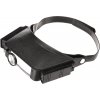 Stirnlupe mit zwei LED-Dioden; Lichtstrom 5 lm; Lichtstärke 6.500 cd. Die Vergrößerung kann durch Linsen gewählt werden: 1,8x; 2,3x; 3,7x; 4,8x. Linsenmaterial PMMA (Acryl), Lupengehäuse ABS, PU. Versorgung 4×AAA 1,5-V-Batterien – nicht im Lieferumfang enthalten.