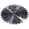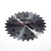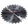 Originelle Quartz-Analoguhr als interessante Ergänzung nicht nur für Tischlerwerkstätte. Zifferblatt aus Stahl-Schneidscheibe mit Durchmesser 200 mm, Zeiger handwerkzeugförmig, Spannungsversorgung mit einer AA-Batterie.