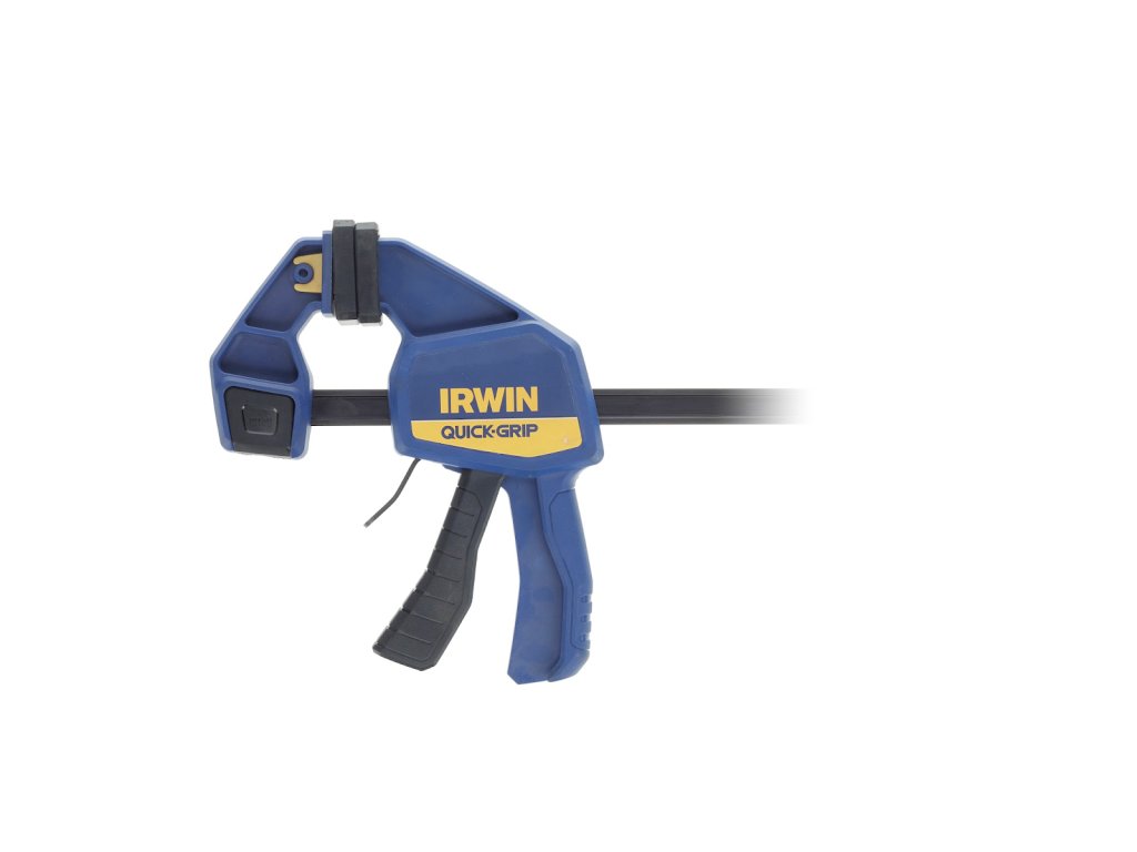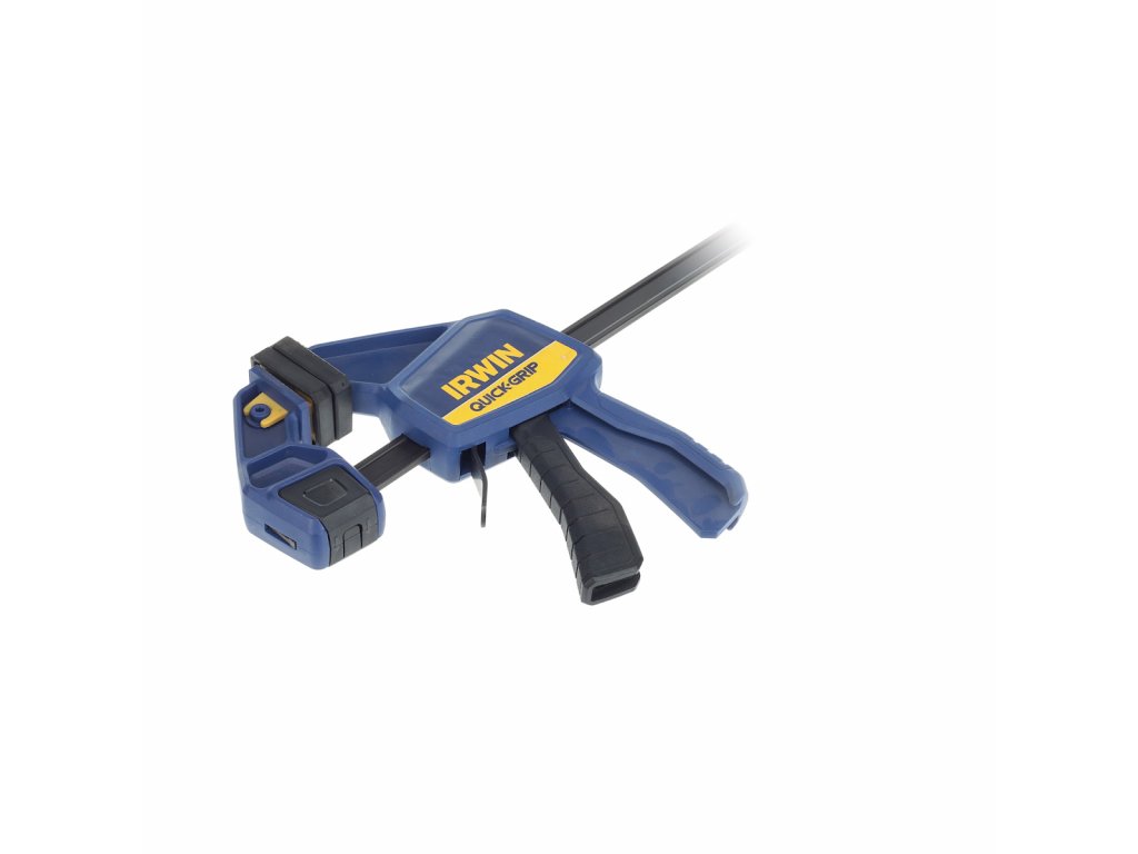 Die Einhand-Abbundklemme IRWIN® QUICK-GRIP® für mittlere Lasten verteilt bis zu 136 kg Spanndruck gleichmäßig. Es ist ideal für kurzzeitiges Halten und Schnellspannanwendungen.