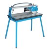 Aufbau: Alu-Führungsrahmen, stabiler Arbeitstisch, Quer-/Winkelanschlag, Kunststoff-Wasserwanne (→ 10 l), Schutzscheibenabdeckung, Rohrständerkonstruktion für den stationären und mobilen Einsatz der Schneidemaschine.