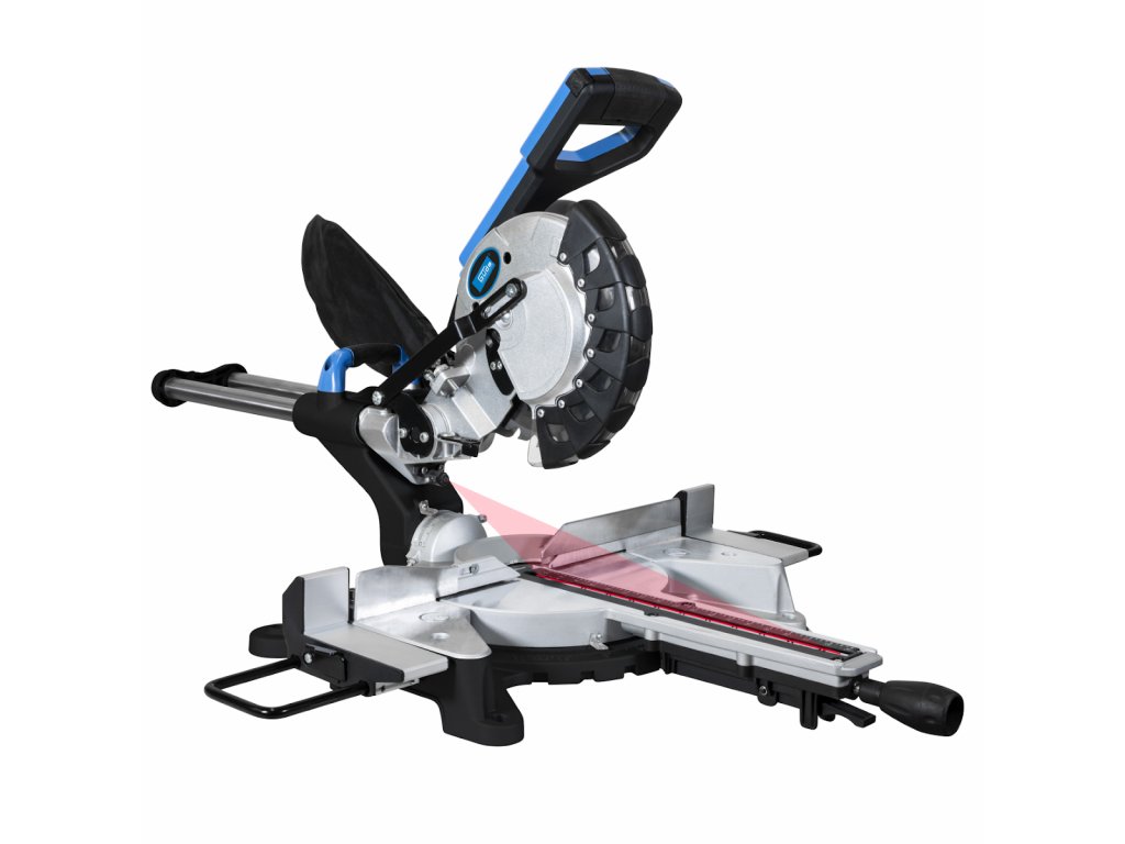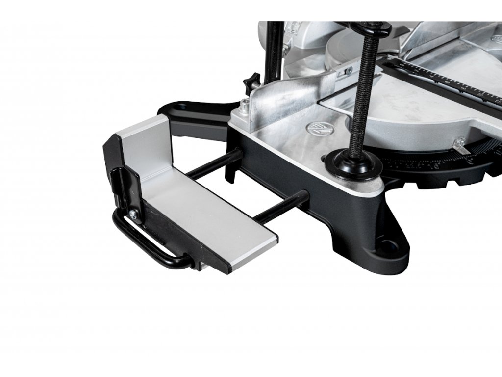 Laser-Schnittlinienanzeige; ausziehbare Stützen zum Schneiden großer Werkstücke; drehbarer Arbeitstisch mit Winkelskala (Zentimeter).