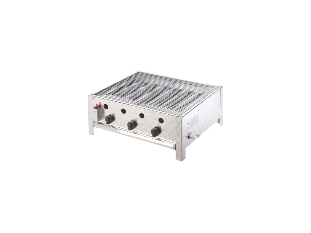 Der Grill aus gebürstetem Edelstahl ist für das Kochen von Speisen im Freien konzipiert. Der Grill ist mit drei Brennern, Piezo-Zündung, Thermosicherung und einem dreiteiligen Rost (Brennerabdeckplatte, Tropfschale und Rost) mit Abmessungen von 650 × 460 mm ausgestattet.