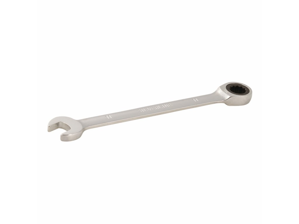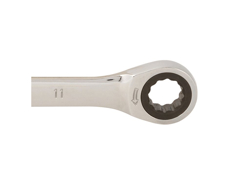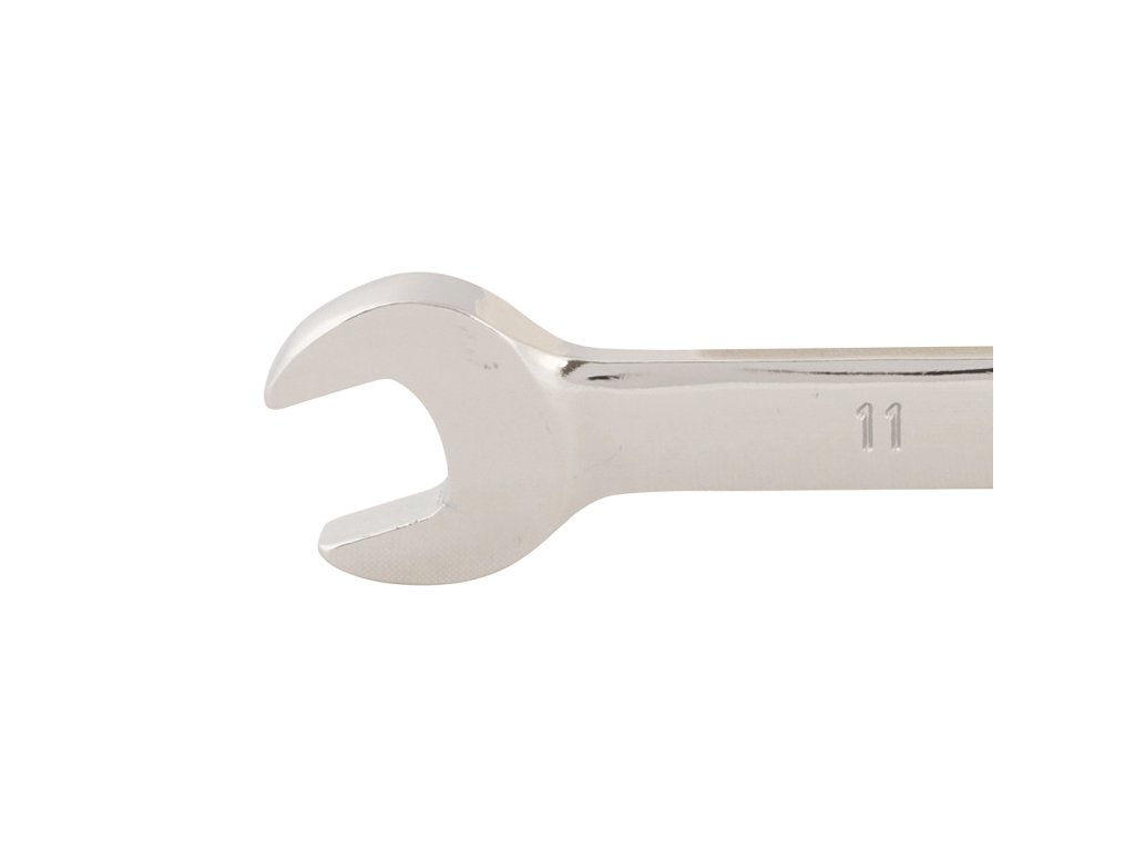 Vergüteter Chrom-Vanadium-Schlüssel mit polierter Oberfläche für Korrosionsbeständigkeit. Kombination aus Seitenschlüssel und Ratschenschlüssel mit 5° Ratsche. Es ermöglicht einen einfachen Zugang bei beengten Platzverhältnissen.