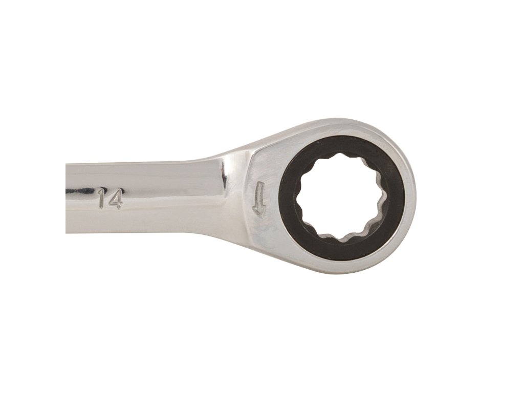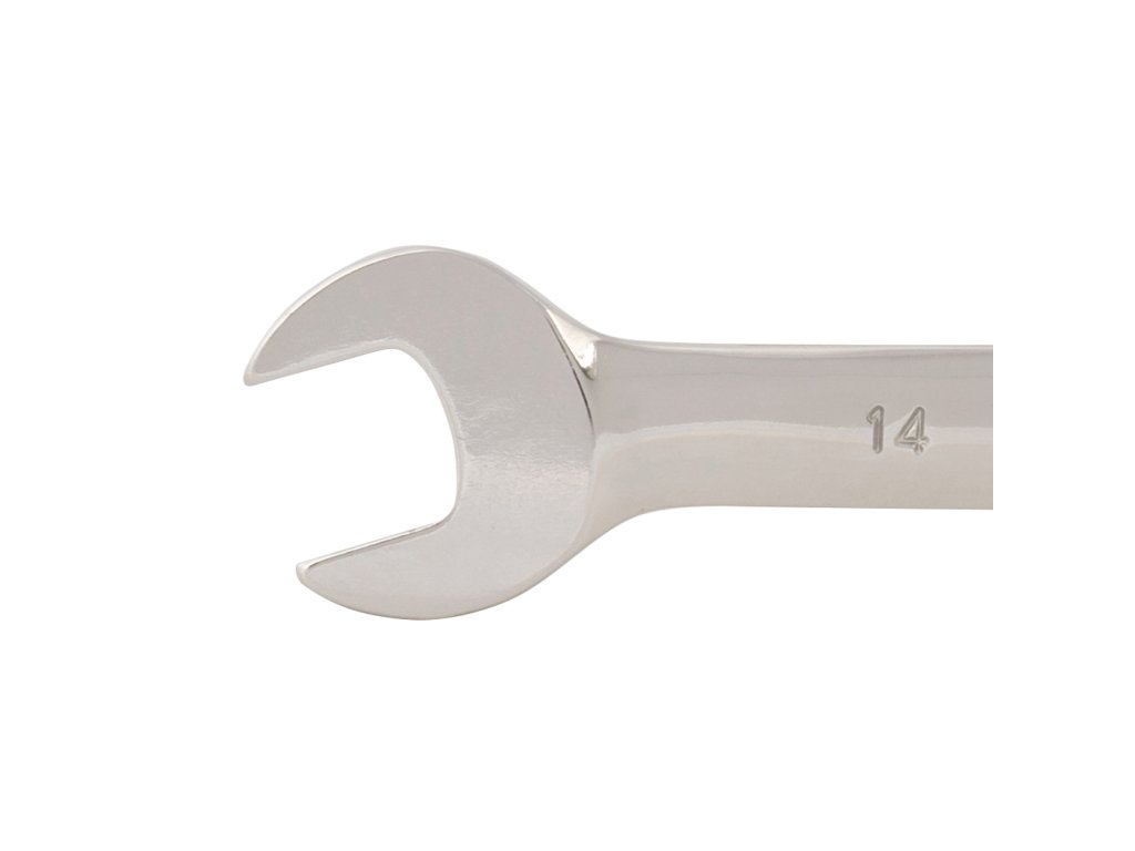 Vergüteter Chrom-Vanadium-Schlüssel mit polierter Oberfläche für Korrosionsbeständigkeit. Kombination aus Seitenschlüssel und Ratschenschlüssel mit 5° Ratsche. Es ermöglicht einen einfachen Zugang bei beengten Platzverhältnissen.