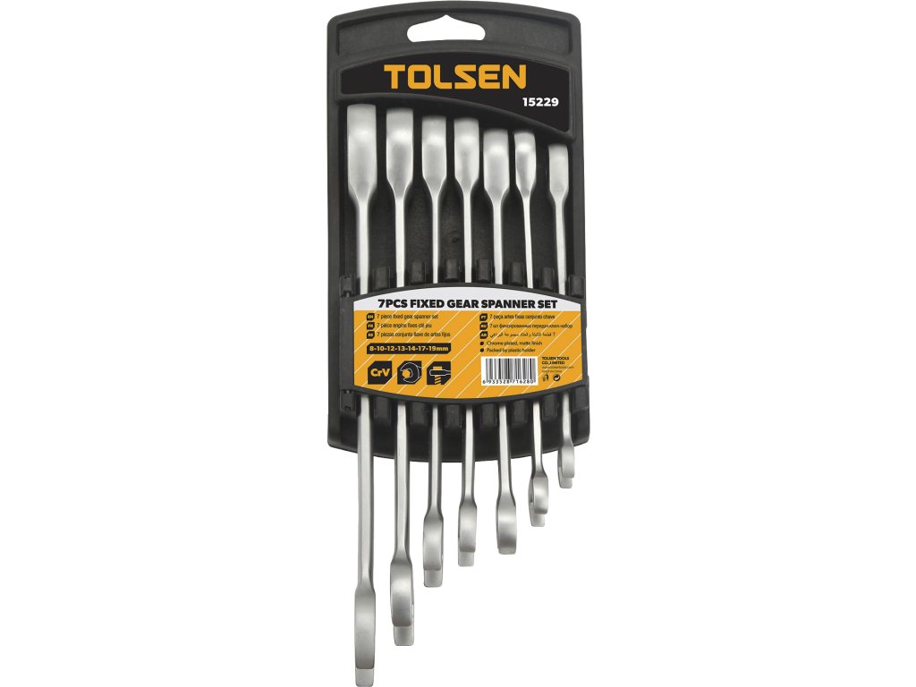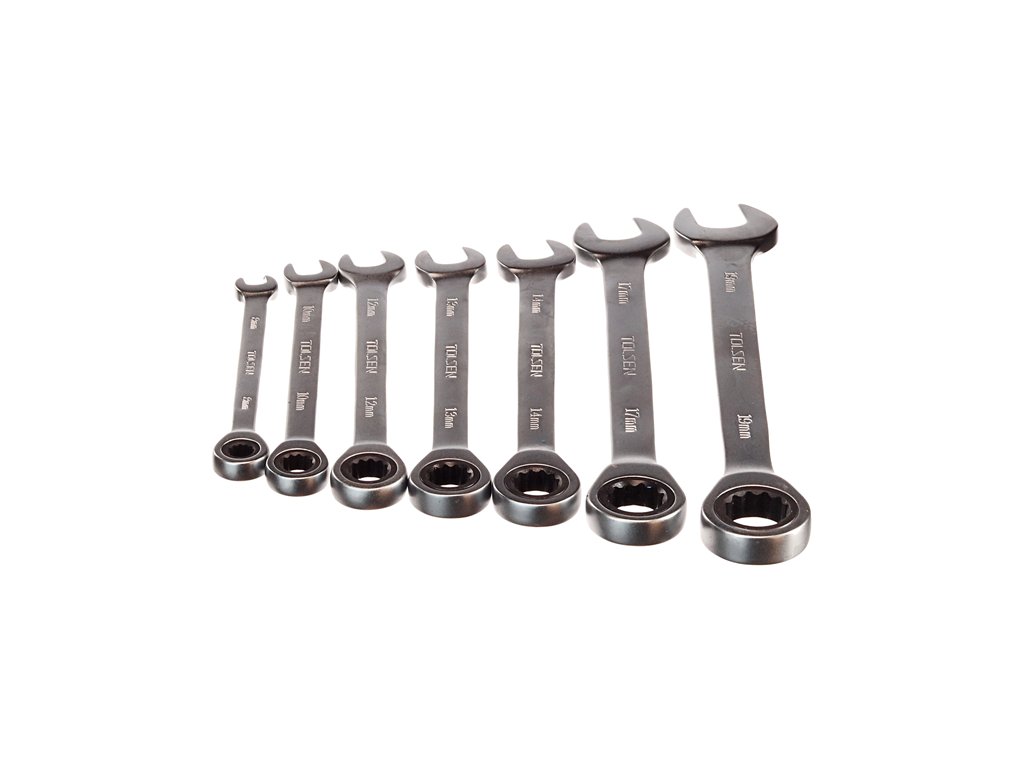 Ratschen-Ring- und Maulschlüsselset. Hergestellt aus hochwertigem Chrom-Vanadium-Stahl und enthält Schlüssel mit den Abmessungen 8 – 10 – 12 – 13 – 14 –17 – 19 mm. In Kunststoff-Hängeverpackung