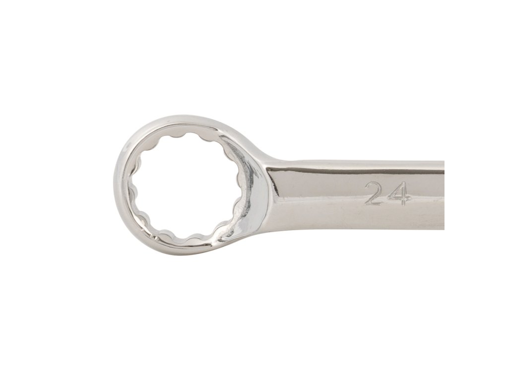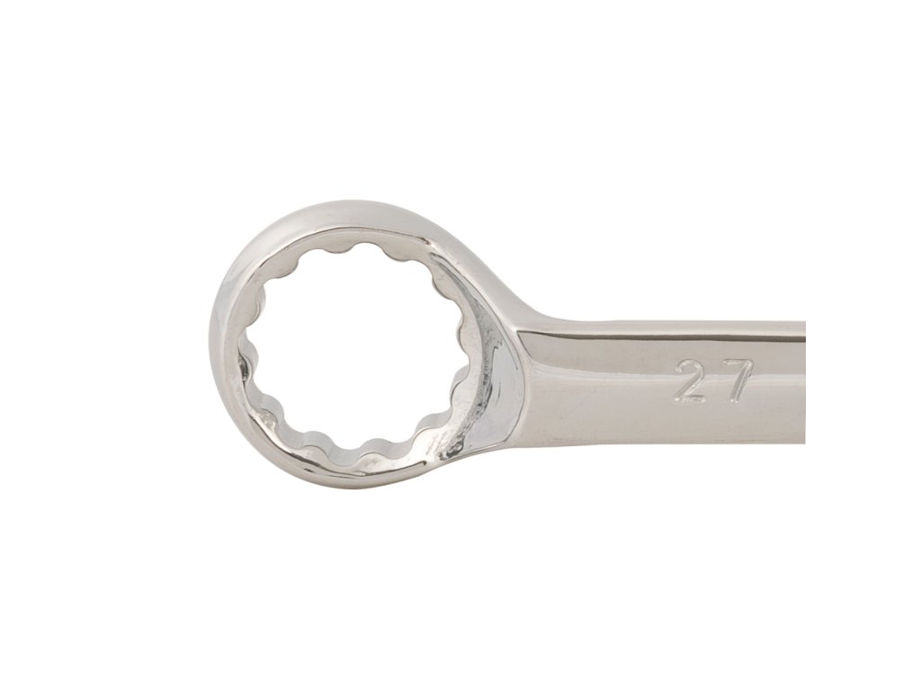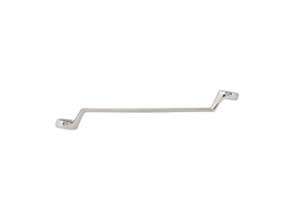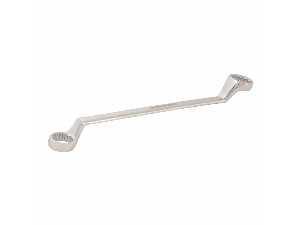 Gehärteter und vergüteter Chrom-Vanadium-Stahl, vollständig poliert. Doppelseitiger metrischer Ringschlüssel, versetzt zum Schaft.