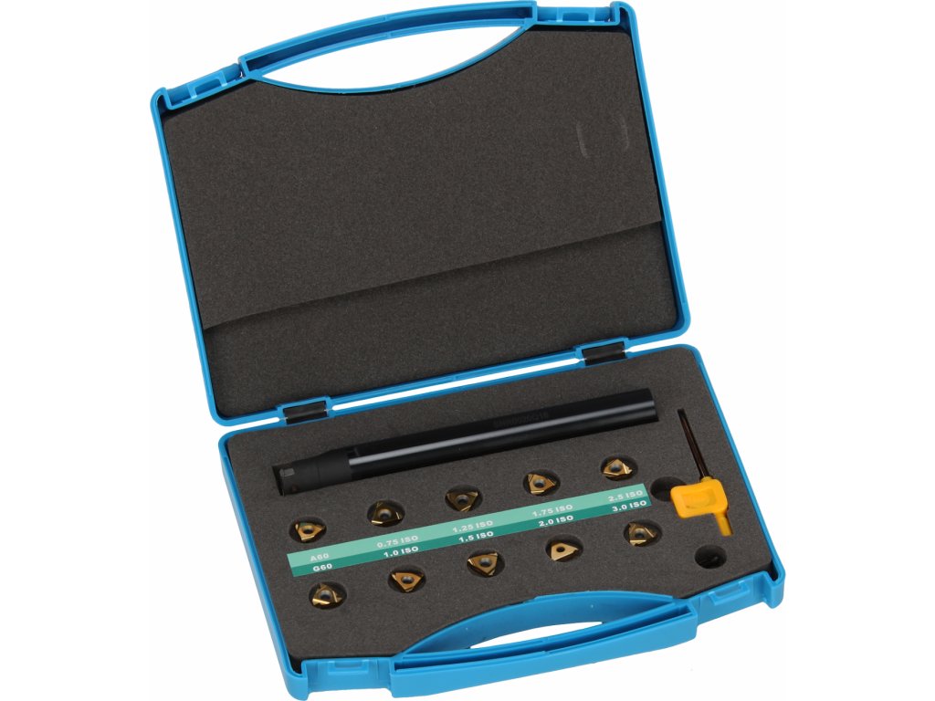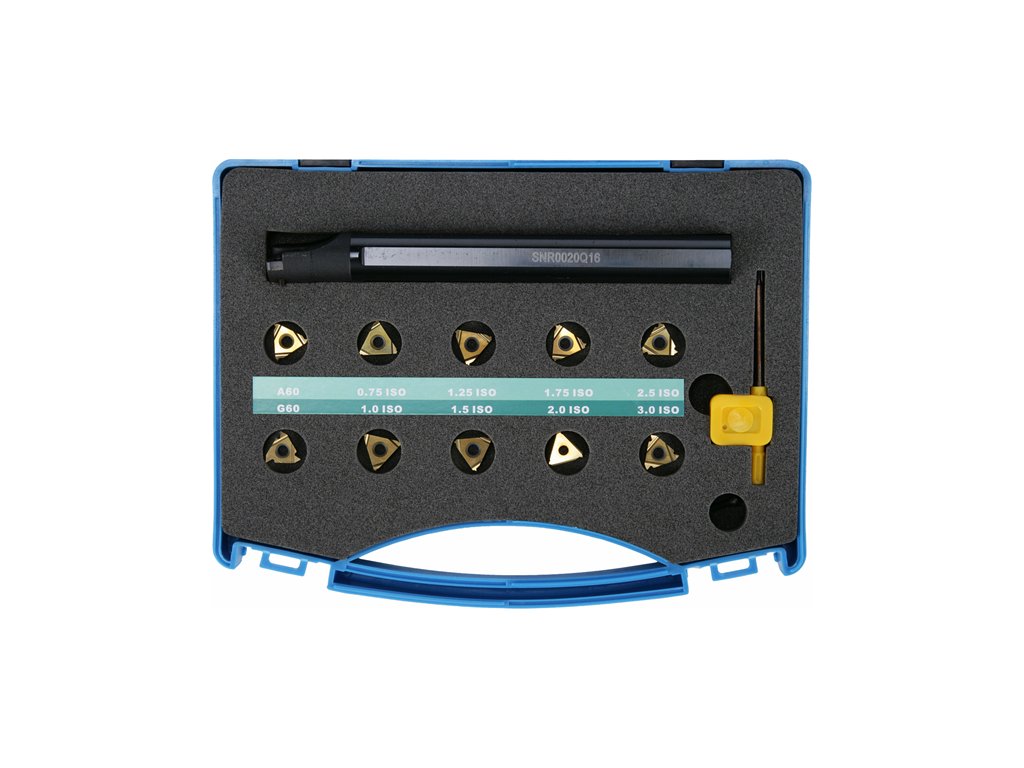 10 Innengewindemesser für Drechsler (16NRA60, 16NRG60, 16NR0.75ISO, 16NR1.0ISO, 16NR1.25ISO, 16NR1.5ISO, 16NR1.75ISO, 16NR2.0ISO, 16NR2.5ISO, 16NR3.0ISO). Inklusive Schlüssel T15, Halter SNR0020S16 und Schraube M3,5 × 12. Alles in einem Kunststoffkoffer.