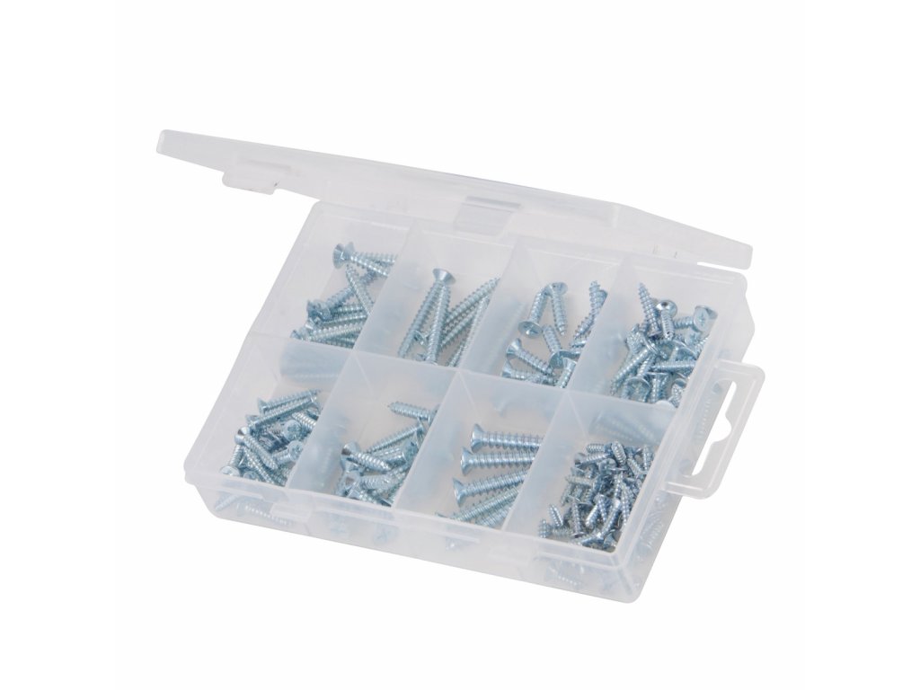 Verzinkt, korrosionsbeständig. PZD selbstschneidende Senkkopfschrauben. Er ist in verschiedenen metrischen Größen erhältlich: 3 × 12, 3,5 × 16, 3,5 × 19, 4 × 16, 4 × 19, 4 × 25, 4 × 30 und 5 × 30 mm. Praktischer Aufbewahrungskoffer mit Fächern.