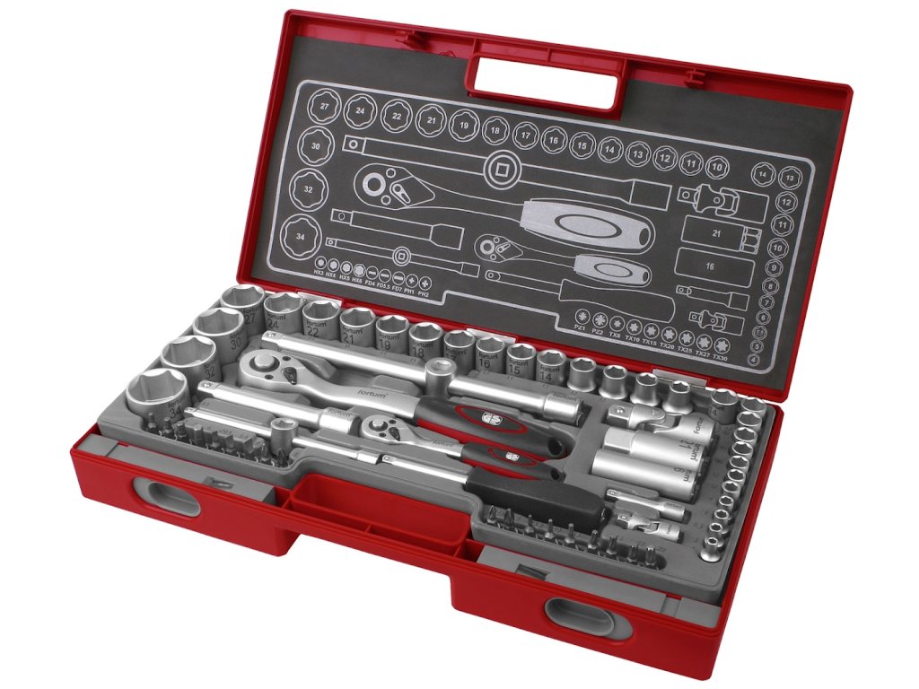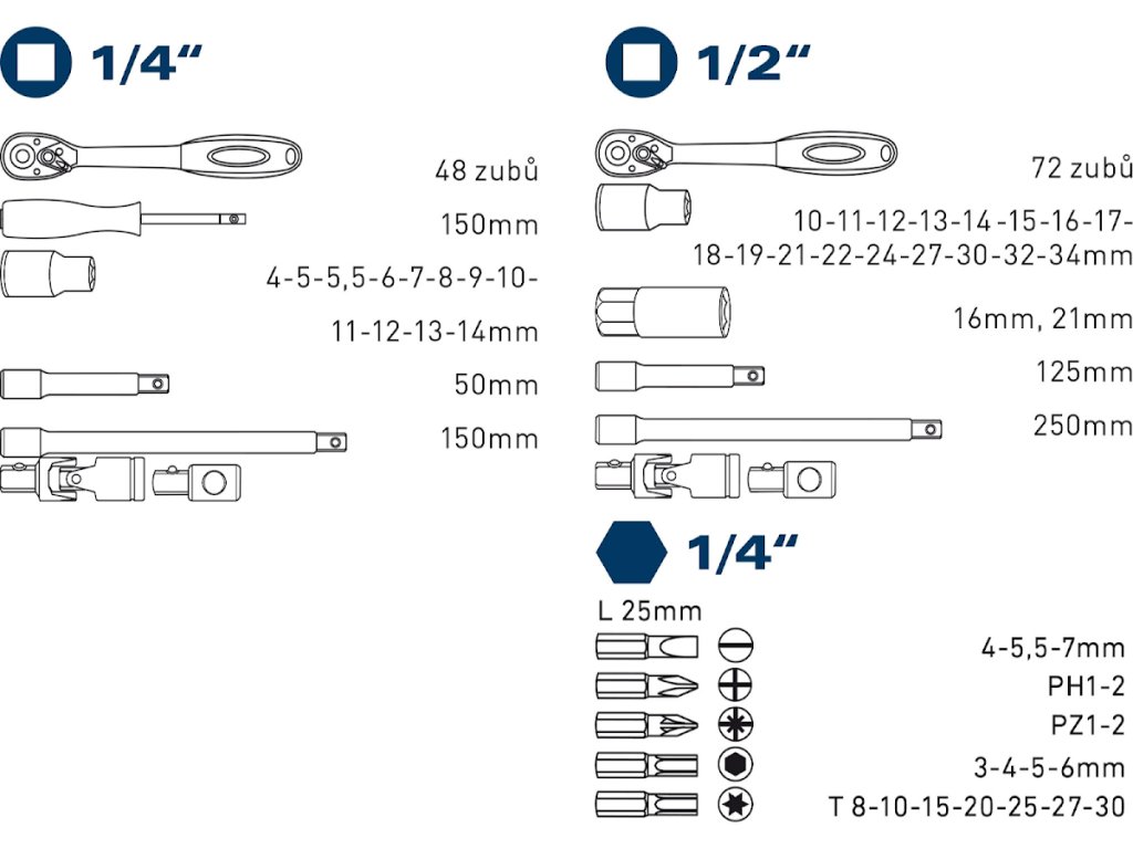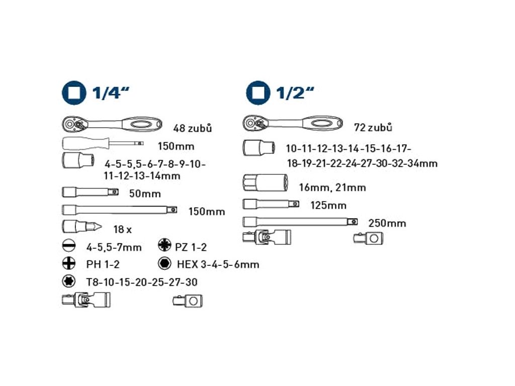 Kopf 1/4" 4; 5; 5,5; 6; 7; 8; 9; 10; 11; 12; 13; 14 mm, 1 × Knarre 72 Zähne, 1 × Aufsatz 50 mm, 1 × Aufsatz 150 mm, 1 × Aufsatz mit Griff 150 mm, 18 × Schraubaufsatz: flach 4 - 5; 5 - 7; Kreuz PH 1 - 2; PZ 1 - 2, Inbus 3; 4; 5; 6, TRX 8; 10; 15; 20; 25; 27; 30, 1 × Kardangelenk, 1 × Adapter 1/2" für Drehkreuz. Kopf 1/2" 10; 11; 12; 13; 14; 15; 16; 17; 18; 19; 21; 22; 24; 27; 30; 32; 34 mm, verlängerte Köpfe 16; 21 mm, 1 × Knarre 72 Zähne, 1 × Aufsatz 250 mm, 1 × Aufsatz 125 mm, 1 × Kardangelenk, 1 × Adapter 1/2" für Windeisen.