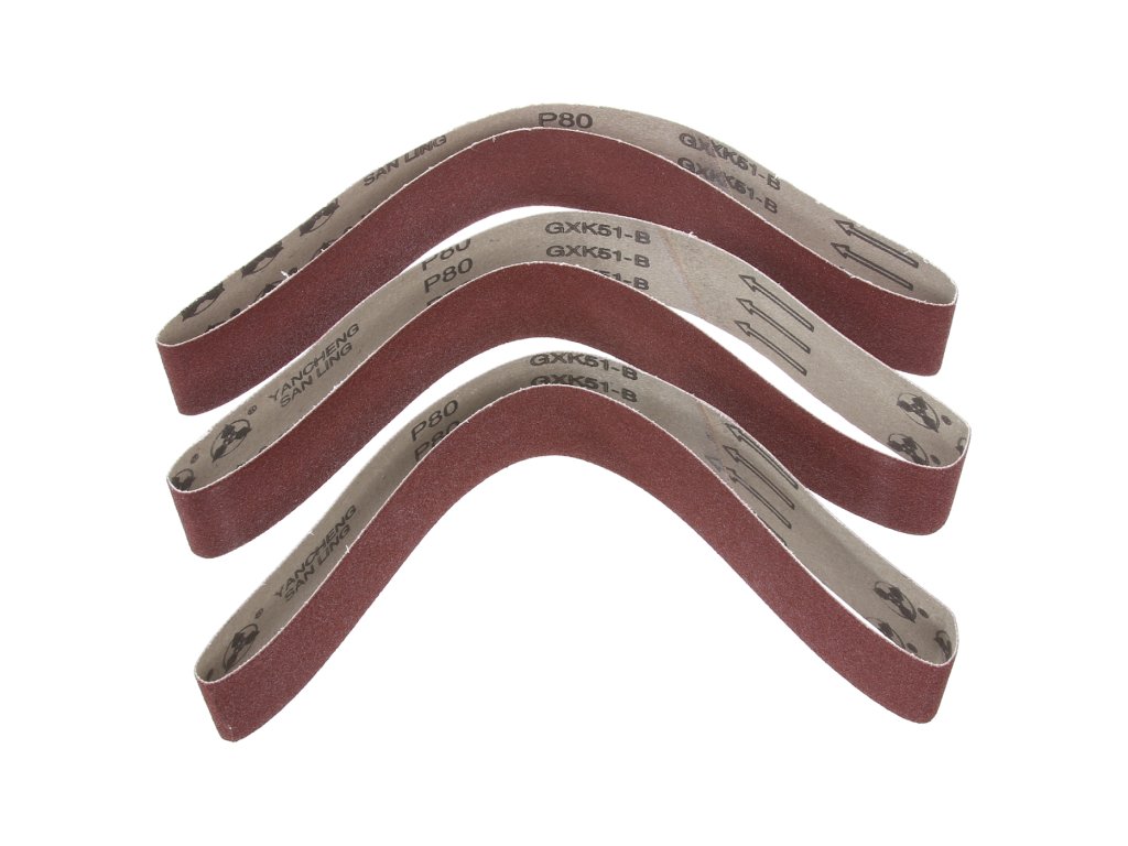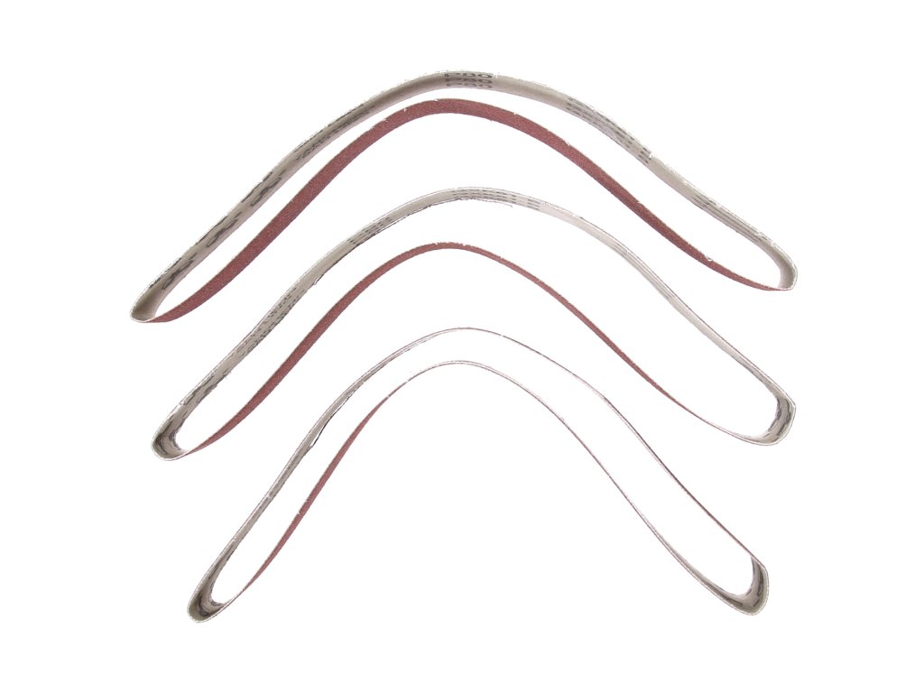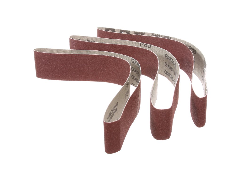 Drei Schleifbänder zur Bearbeitung von Holz, Lacke, Farben, Metalle, Kunststoffe usw. Banduntergrund: O – Lein, Oberfläche Harzkleber und beständige Korundkörner. Bandlänge 686 mm, Bandbreite 50 mm. Verpackungstyp: SB (3 – teilige einhängbare Sätze). Schleifbänder für kombinierte Schleifmaschine GDS 150 K (Bestell.-Nr. 55108).