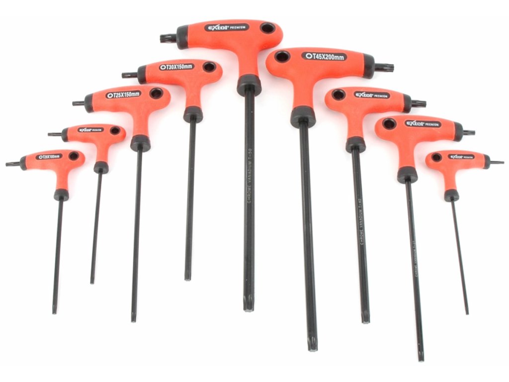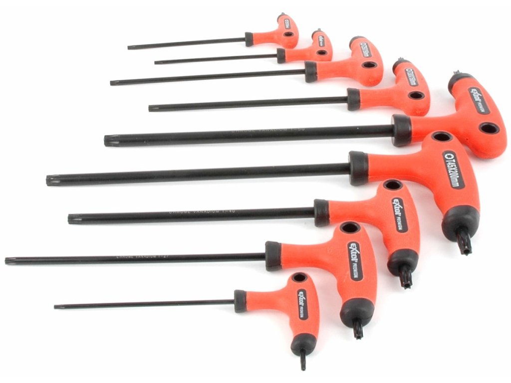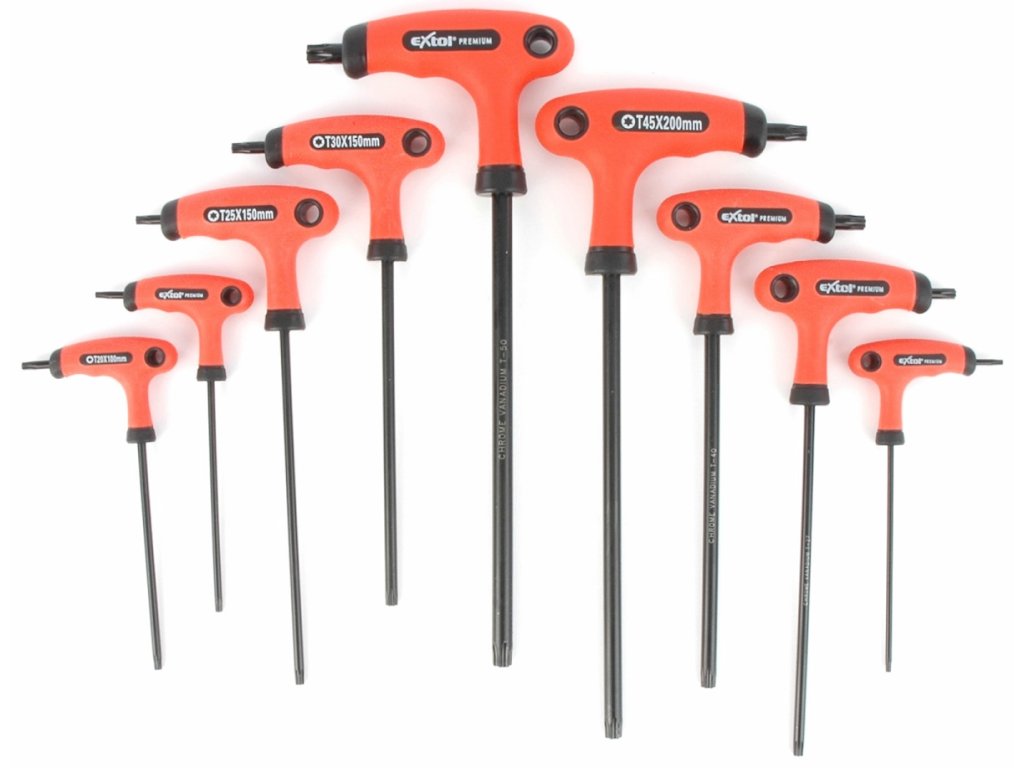 Satz von CrV TORX Schlüsseln T10; 15; 20 × 100 mm, T25; 27; 30; 40 × 150 mm, T45; 50 × 200 mm. Zur Übertragung größerer Kraft T- Haltegriff.