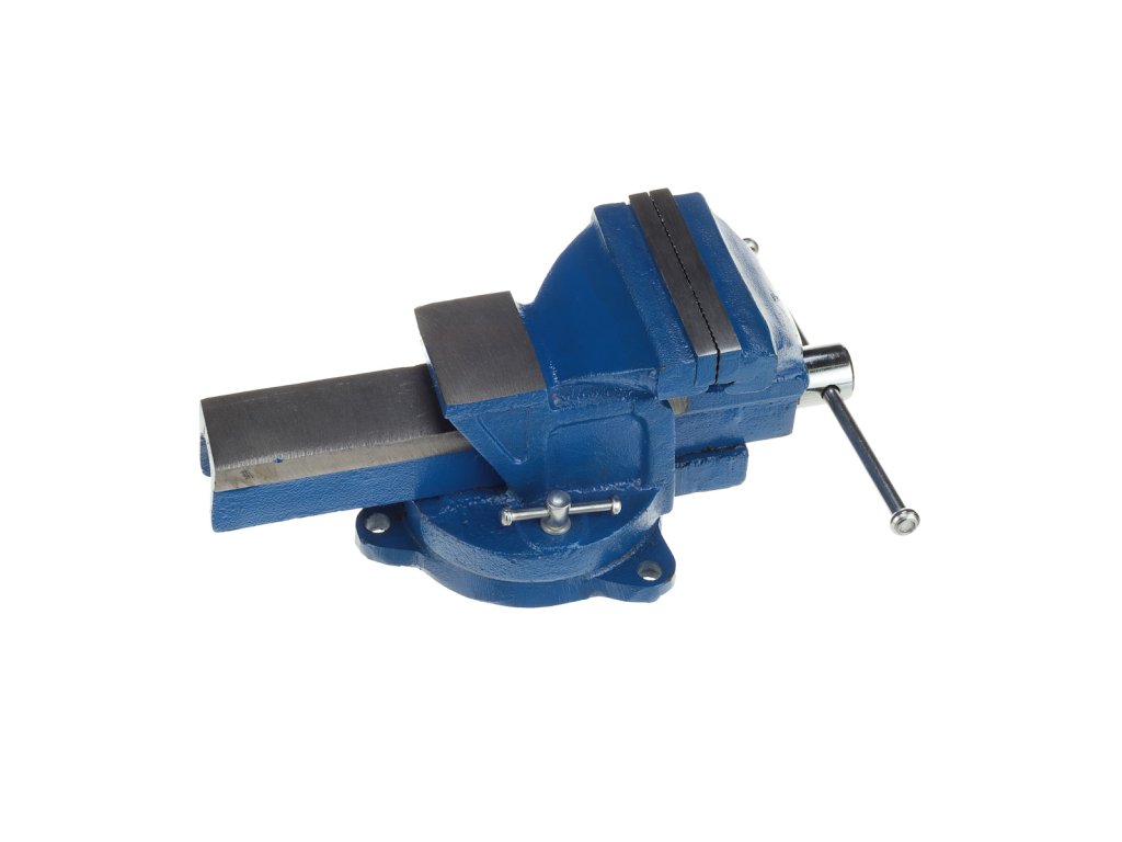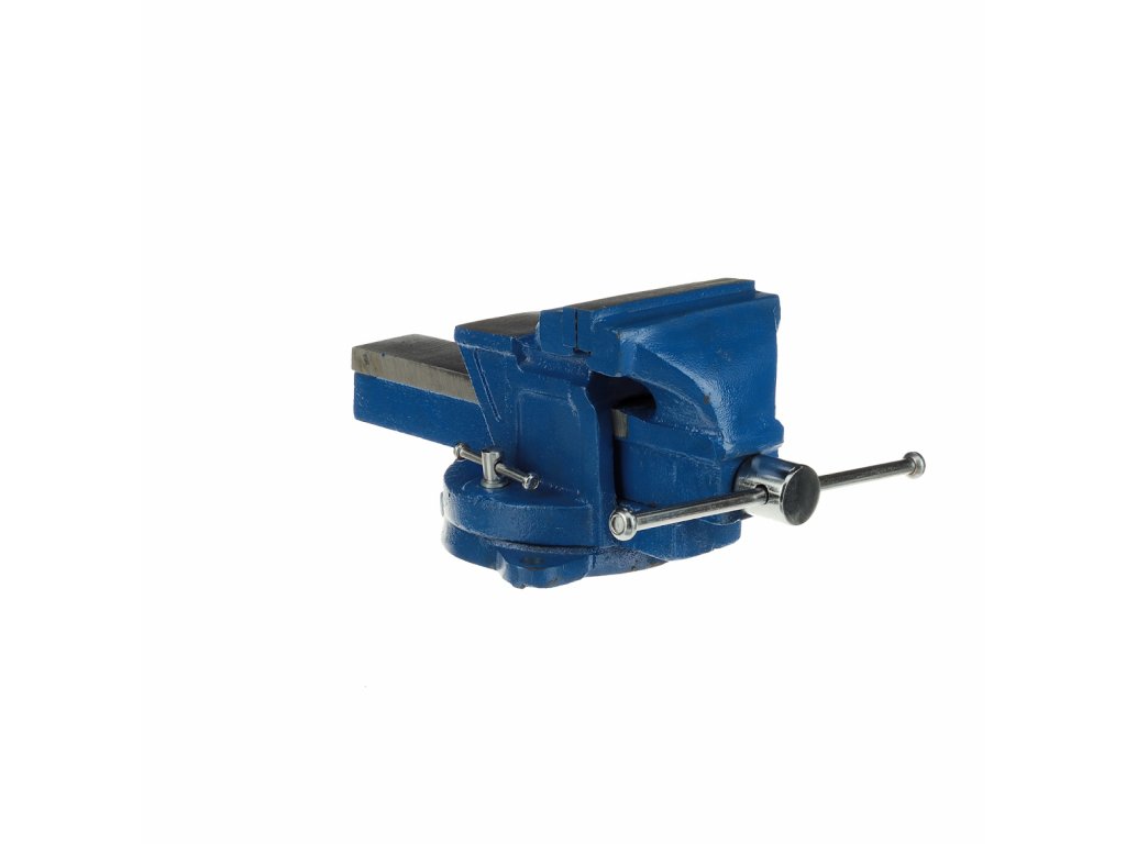 Ein massiver Schraubstock mit einem Amboss aus Gusseisen, gehärteten Backen, das Drehen des Schraubstocks mit einem Drehteller, ein Körper und ein beweglicher Arm jeweils in einem Stück gegossen, garantieren große Haltbarkeit und Festigkeit.