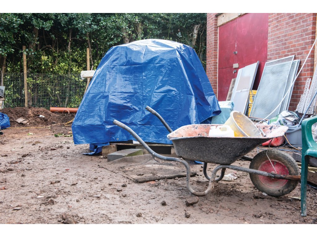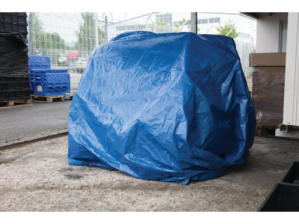 UV-beständige, seilverstärkte Plane aus Polyethylen mit Ösen aus Edelstahl. Hohe Beständigkeit gegen Wasser und Schimmel.