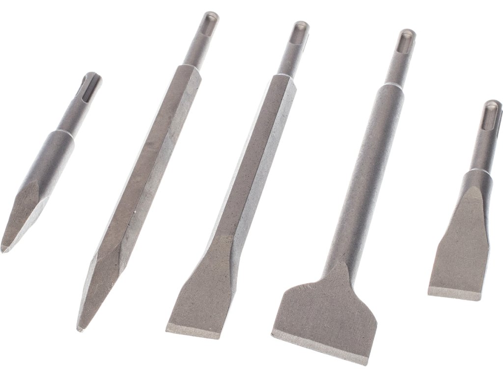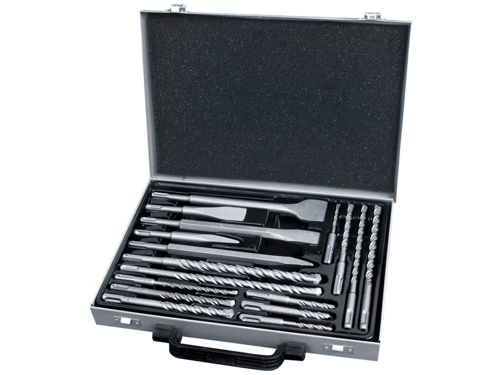 Inhalt: 17 Schaftwerkzeuge SDS PLUS, übersichtlich im Metallkoffer gelagert. Flachmeißel 250 × 20 mm, 250 × 40 mm und 140 × 20 mm, Spitzmeißel 250 mm und 140 mm, Bohrer 110 mm lang ø5, 6, 8 und 10 mm, 160 mm lang ø6, 8, 10 und 12 mm, 210 mm lang ø8 und 10 mm, 260 mm lang ø12 und 14 mm.