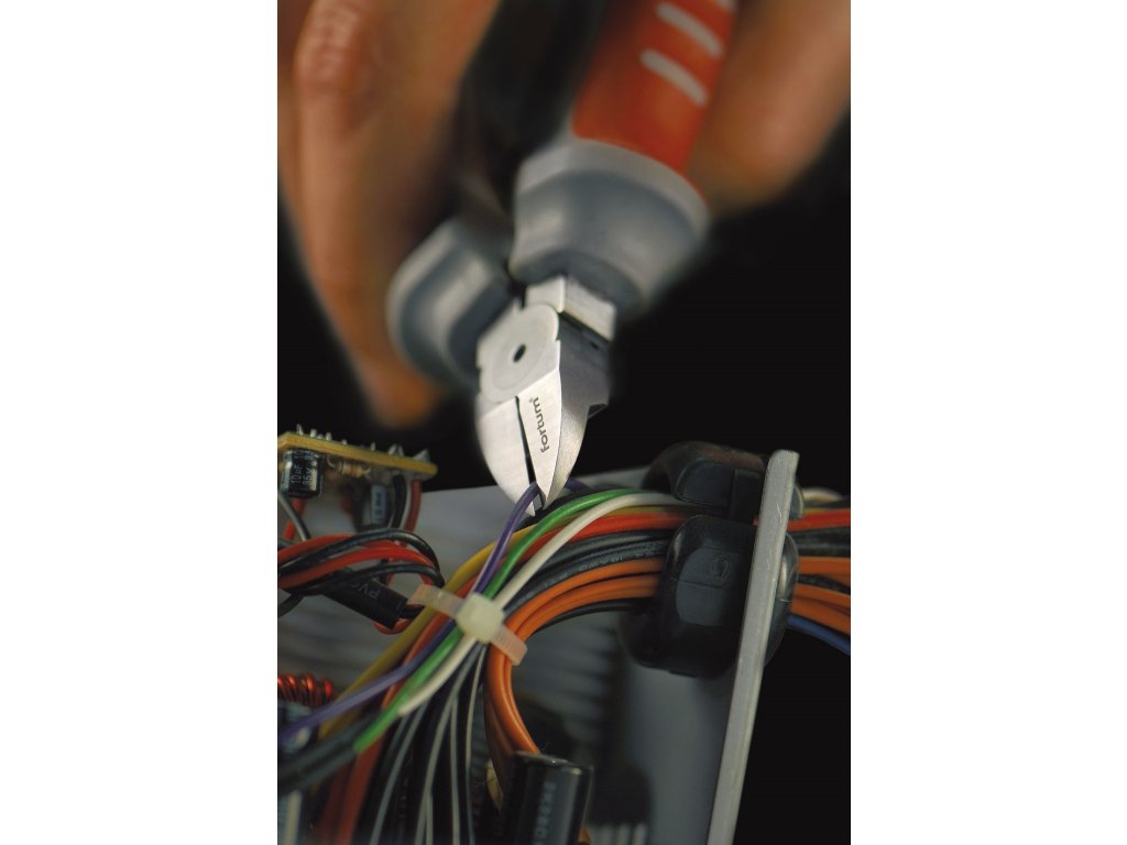 Die Seitenschneidzange ist aus Material CrV6150 gefertigt, induktiv gehärtete Backen, TPR-Griffe, Backen poliert und lackiert, Zertifikat TÜV/GS, DIN.
