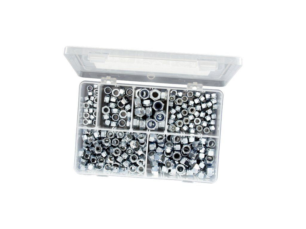 Set von 260 St. Stahl-Sicherungsmuttern mit Nylon-Einsatz im Kunststofforganiser mit Deckel. Die Verpackung enthält die Größen M6, M8, M10, 1/4“UNF, 5/16“UNF, 3/8“UNF.