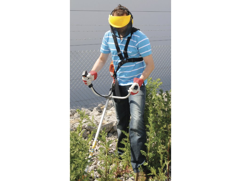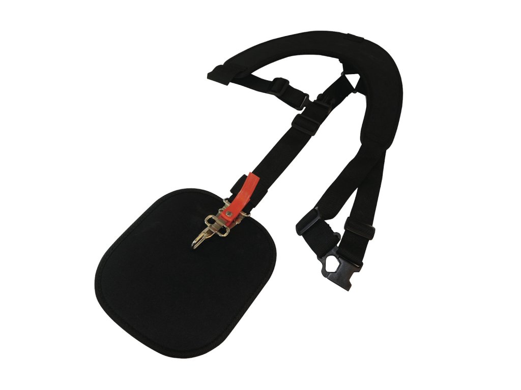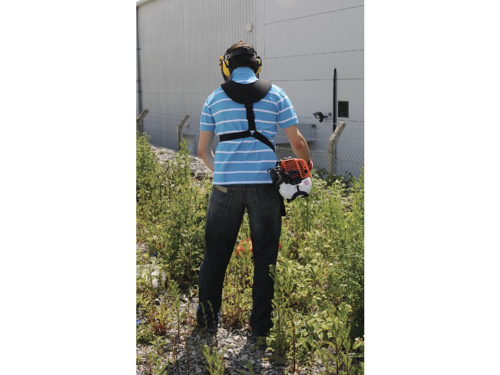 Gepolstertes Schulterpolster und voll verstellbare Nylonträger für einen sicheren und bequemen Sitz. Schnellverschluss-Clip und Oberschenkelschutzpolster. Gleichmäßige Gewichtsverteilung. Für den Einsatz mit Baumschneidern, Freischneidern, Langstreckenscheren etc.