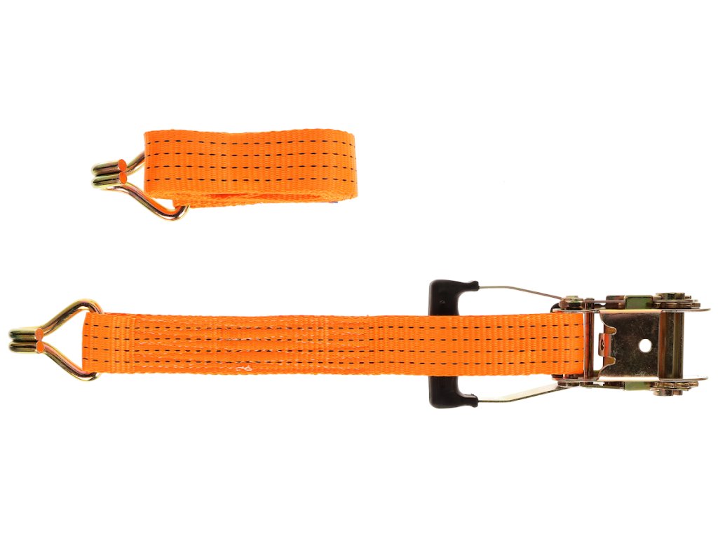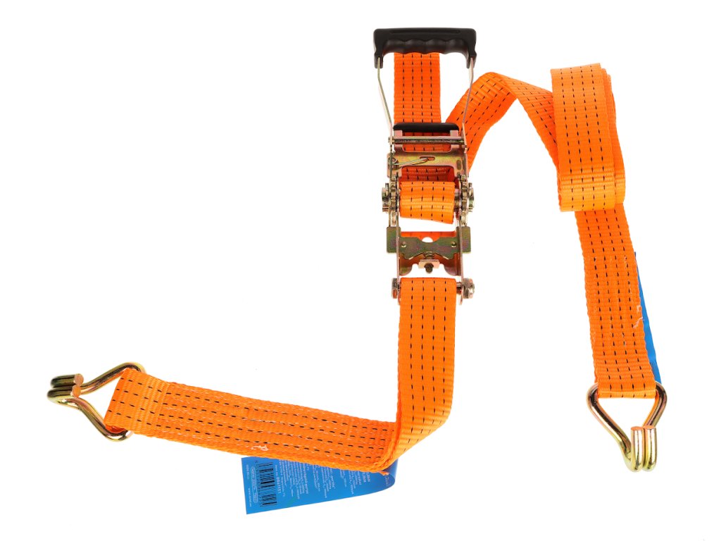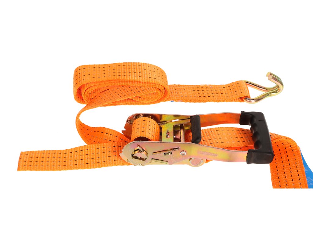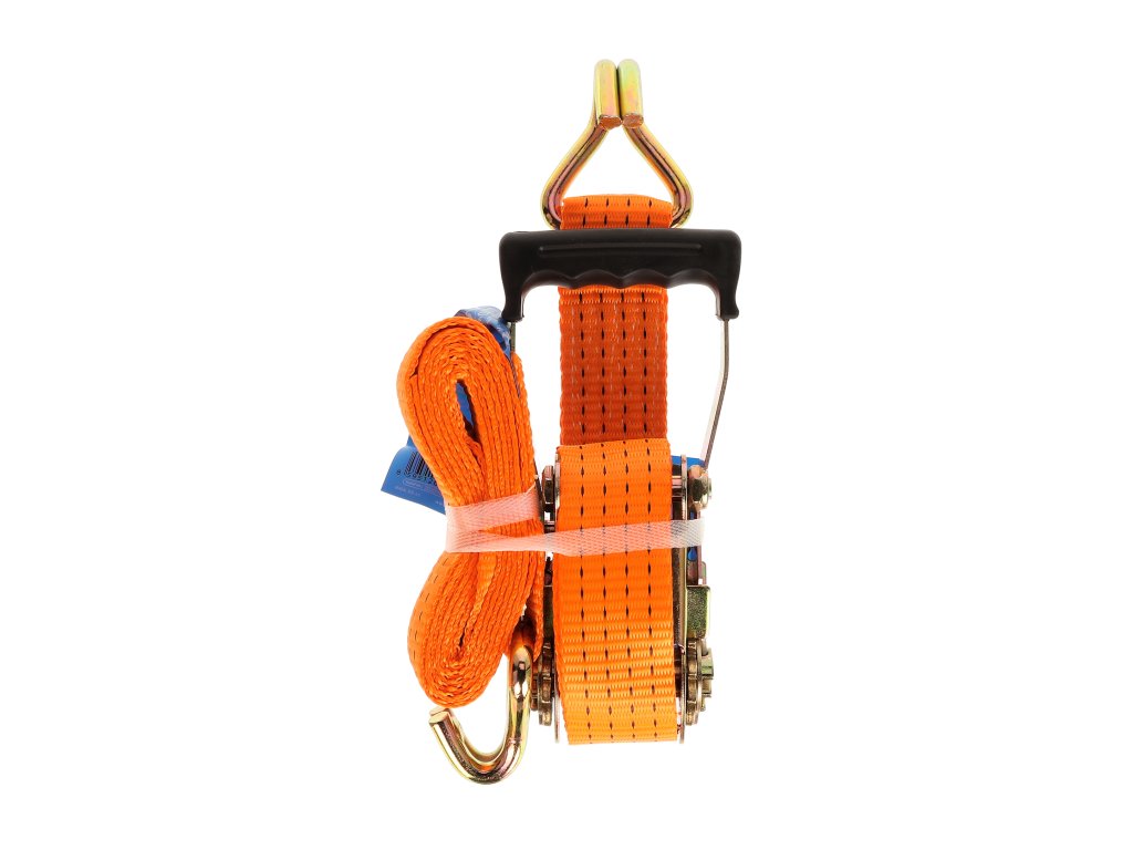 Mit Ratsche mit gummiertem Griff und Haken. Max. Belastung 4 000 kg, Bandfestigkeit beim Umschlingen 39,2 kN; Zugfestigkeit 19,6 kN; Dehnung bei max. Belastung 7%; Teil mit der Ratsche 0,5 m lang. Bandmaterial 100% Polyester (PES).
