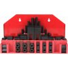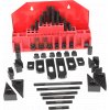 Für T-Nuten 16 mm bestimmt. 24 Bolzen, Länge 75, 100, 125, 150, 175 und 200 mm, 4 Verbindungsmuttern, 6 T-Segmente, 3 Paare Spannstücke, 6 Bundmuttern und 3 Paare Stufenblöcke.