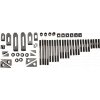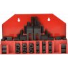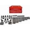 Für T-Nuten 18 mm bestimmt. 24 Bolzen, Länge 75, 100, 125, 150, 175 und 200 mm, 4 Verbindungsmuttern, 6 T-Segmente, 3 Paare Spannstücke, 6 Bundmuttern und 3 Paare Stufenblöcke.
