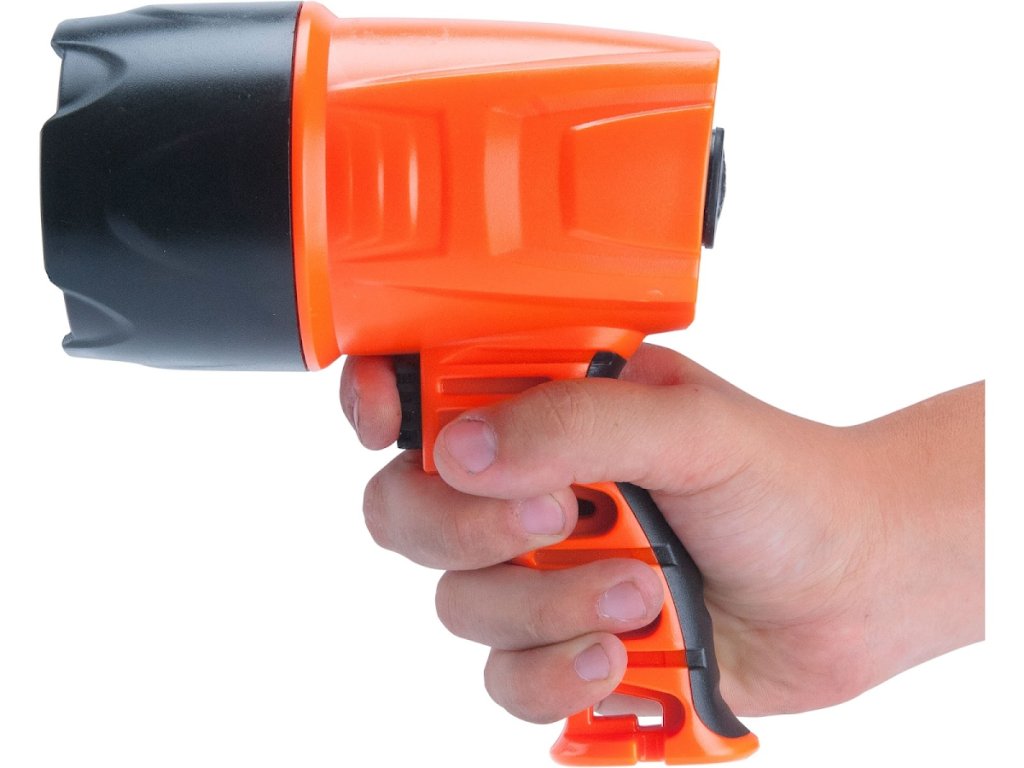 - 3 W, Reichweite 330 m, 3,7 V Li-Ion 1500 mAh, Leuchtdauer mit einer Ladung: 2 h, Ladezeit: 4 - 5 h, feuchtigkeits- und spritzwasserbeständig, Akkuladung 230 V/12 V DC, Gewicht mit Akku 380 g