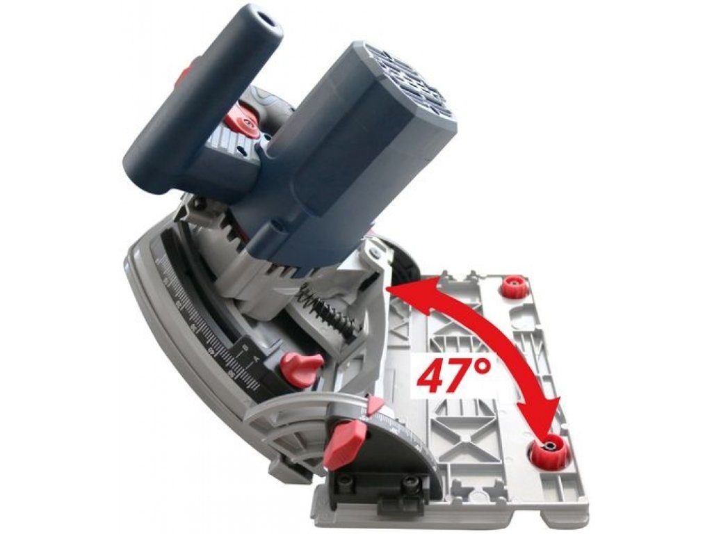 Präzise Einstellung der Schnitttiefe (→ 0°: 0 - 52 mm; 45°: 0 - 37 mm), seitliche Neigung der Säge (→ Bereich: 0 - 47°; Schrägschnitte), Wellenarretierung für einfach/schnell Klingenwechsel.