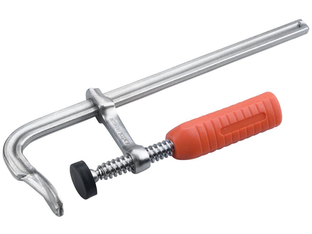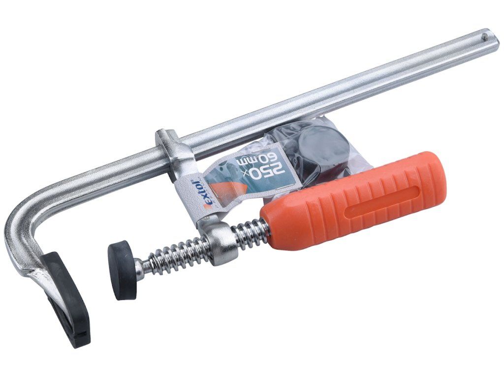 Tischlerklemme Typ "F" - kompaktes massives Profil, Anlageflächen mit Kunststoff bedeckt, ergonomischer Kunststoffgriff.