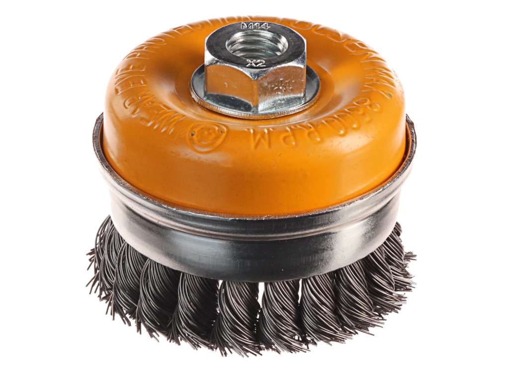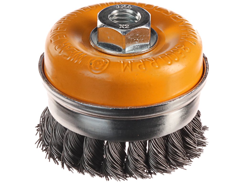 Ideal zum Entfernen von Rost und Farbe von Metalloberflächen. Drahtdurchmesser: 0,5 mm, Zopflänge 18 mm, Bürstendurchmesser 75 mm (Gehäusedurchmesser 77 mm), Befestigungsmutter M14 x 2 mm, Bürstenhöhe gesamt 66 mm, max. Drehzahl 8.500 U/Min.