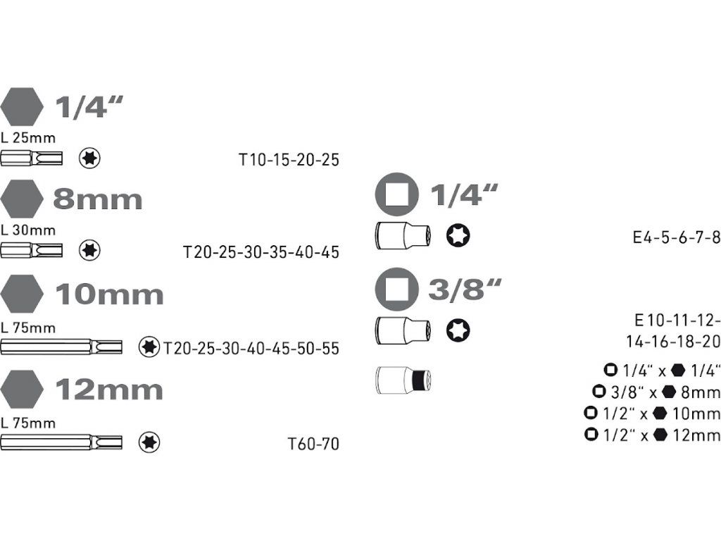 Spitzen - TORX Innensechskant: 1/4": E4 - 5 - 6 - 7 - 8, 3/8": E10 - 11 - 12 - 14 - 16 - 18 - 20 - Spitzen: 1/4" × 25 mm Spitzen: T10 - 15 - 20 - 25, 8 mm (5/16") Spitzenx30 mm: T20 - 25 - 30 - 35 - 40 - 45, Spitzen 10 × 75 mm: T20 - 25 - 30 - 40 - 45 - 50 - 55, Spikes 12 × 75 mm: T60 - 70