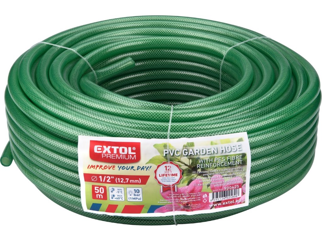Hochwertiger Gartenschlauch aus weichem PVC, verstärkt mit Polyesterfaserverstärkung.