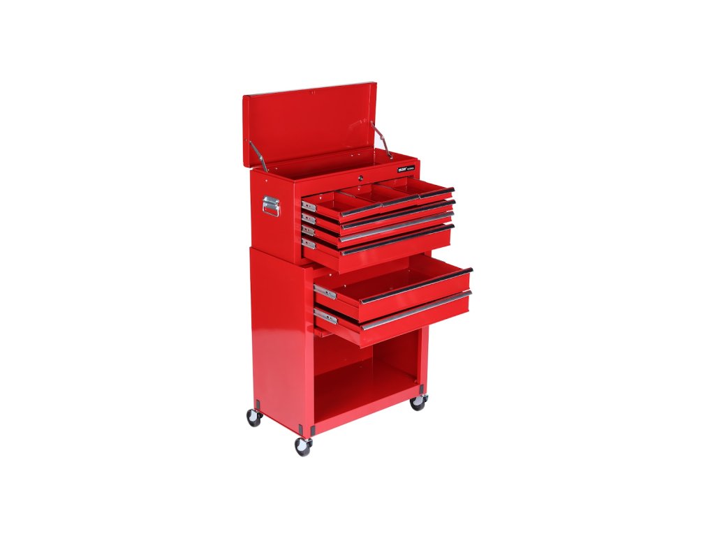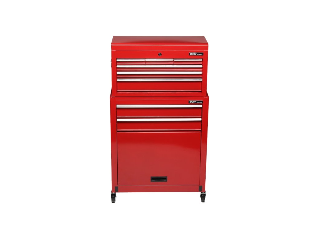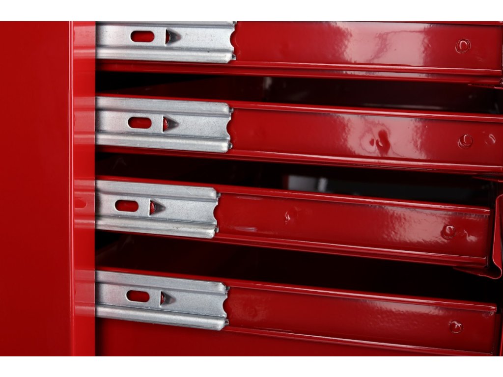Pulverlackierte Stahlkonstruktion, 4 Lenkräder, besteht aus zwei Teilen, oberer Schrank mit Deckel mit 1 hohen, 2 niedrigen und 3 niedrigen engen Schubladen, unterer Schrank mit 2 hohen Schubladen und unterer Ablage. Schubladen auf Gleitführungen. Abmessungen: 1. - 600 × 260 × 340 mm, 2. - 616 × 330 × 658 mm.