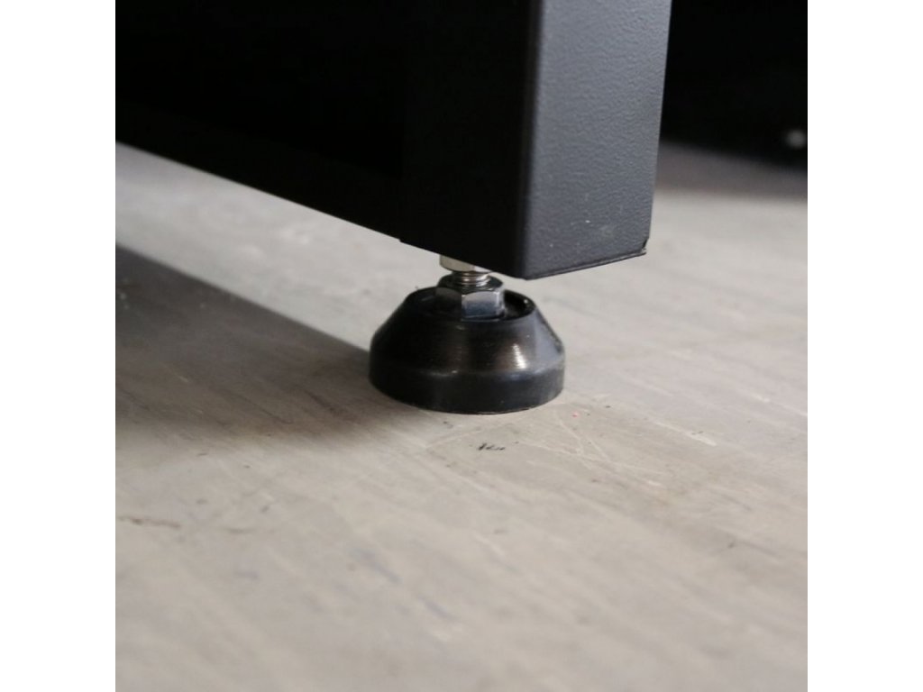 Konstruktion: Stahlrahmen, Sockel inkl. 4 Stellfüße (→ zum Ausgleich eventueller Bodenunebenheiten), Farbausführung: RAL 9005 (Korpus), RAL 5015 (Schubladen, Tür).