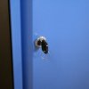 Konstruktion: Stahlrahmen, Sockel inkl. 4 Stellfüße (→ zum Ausgleich eventueller Bodenunebenheiten), Farbausführung: RAL 9005 (Korpus), RAL 5015 (Schublade, Tür).