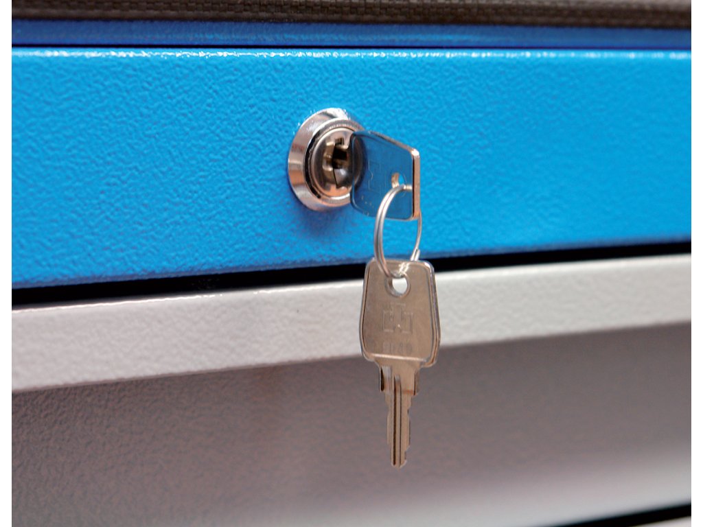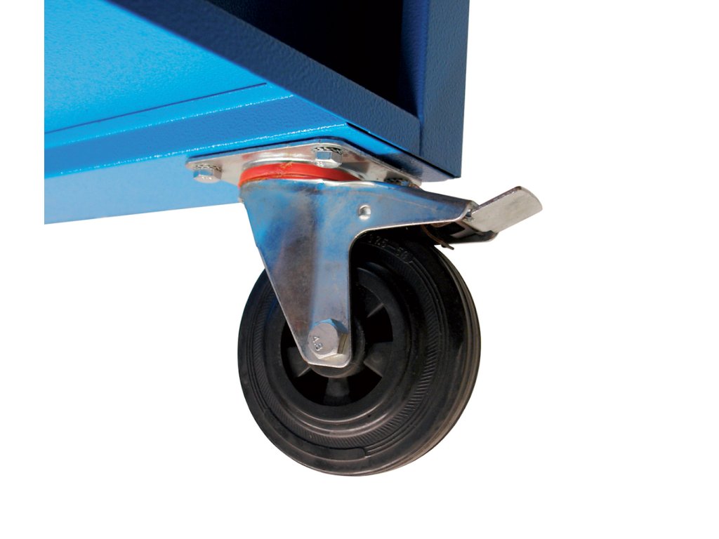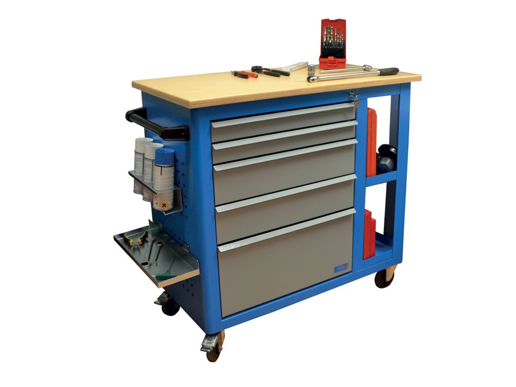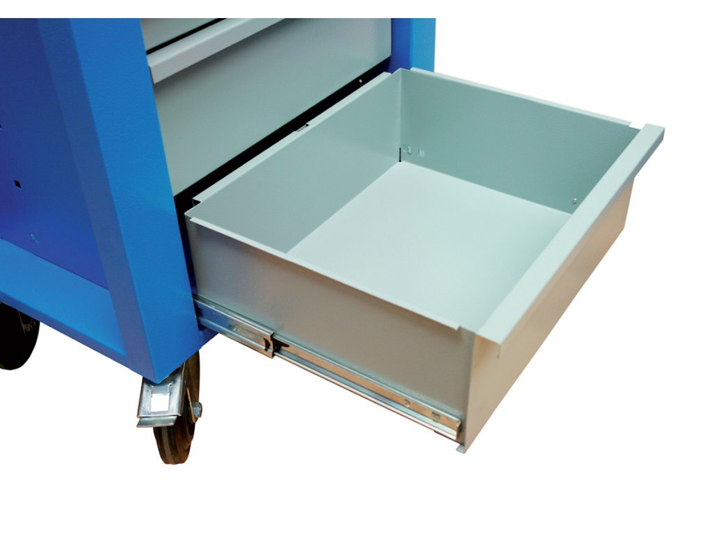 Ausstattung: 5 Schubladen (→ 2 x Höhe 55 mm/2 x Höhe 125 mm/1 x Höhe 270 mm, Zentralverschluss mit Zylinderschloss, 2 Schlüssel); Lochwände zur Befestigung von hängenden Werkzeughaltern (→ Löcher 10 mm2); seitliche Ablagefläche mit Fachboden (→ Maße LxBxH: 447 x 240 x 765 mm); 4 Vollgummiräder (→ Durchmesser: 100 mm, 2 Bock-/2 Lenk-/1 Bremse); Transportgriff.
