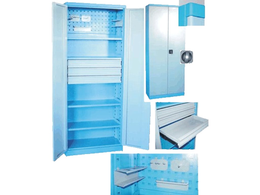 Konstruktion komplett aus Metall, fertig montiert, Pulvermetallurgie, Design mit Rundkanten. Scharniere und Schließstange innen, Stangenschloss, doppelte Sperrung, 4 Fächer und 3 Schubladen, universell verstellbar am oberen Teil von der Innenseite in die Höhe von ca. 340 mm spezielles gelochtes Blech, mit 2 Haltern für Behälter, 1 Werkzeughalter mit 1 Stift und 1 Werkzeughalter mit 4 Stiften. Abmessungen: Breite 780 mm × Tiefe 380 mm × Höhe 1 920 mm.
