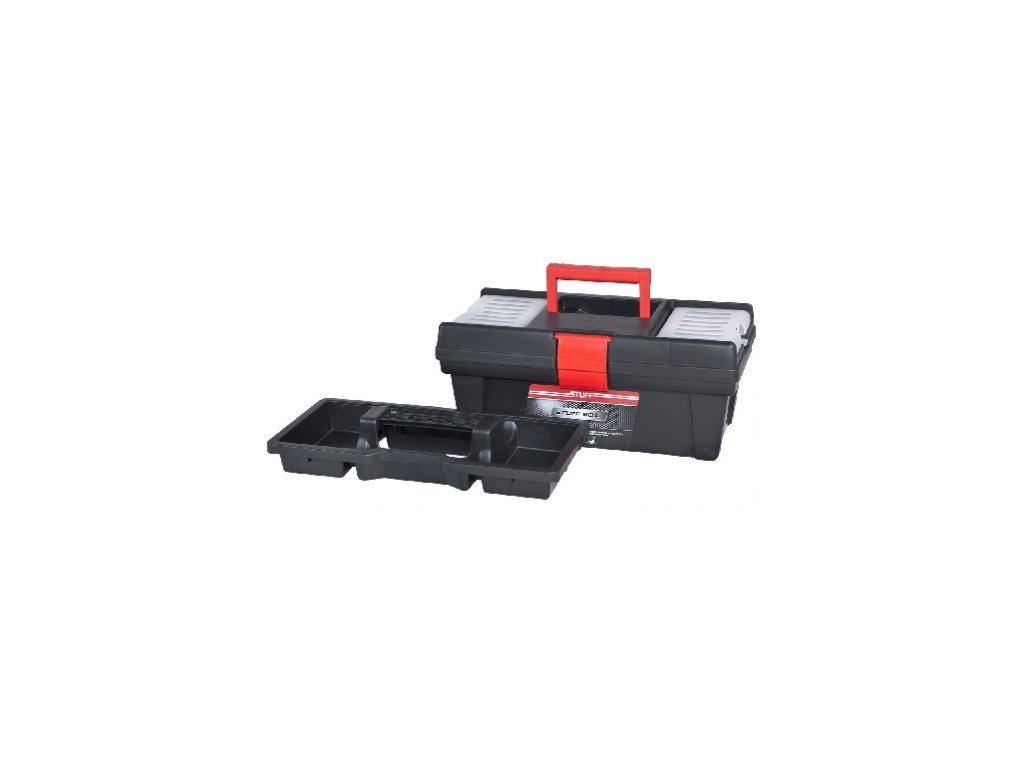 Der STUFF PROFI Werkzeugkoffer ist aus hochwertigem Kunststoff gefertigt, im oberen Teil befinden sich zwei Organizer für Kleinteile, die mit einem Deckel verschlossen sind, und es gibt auch ein Loch für ein Vorhängeschloss."